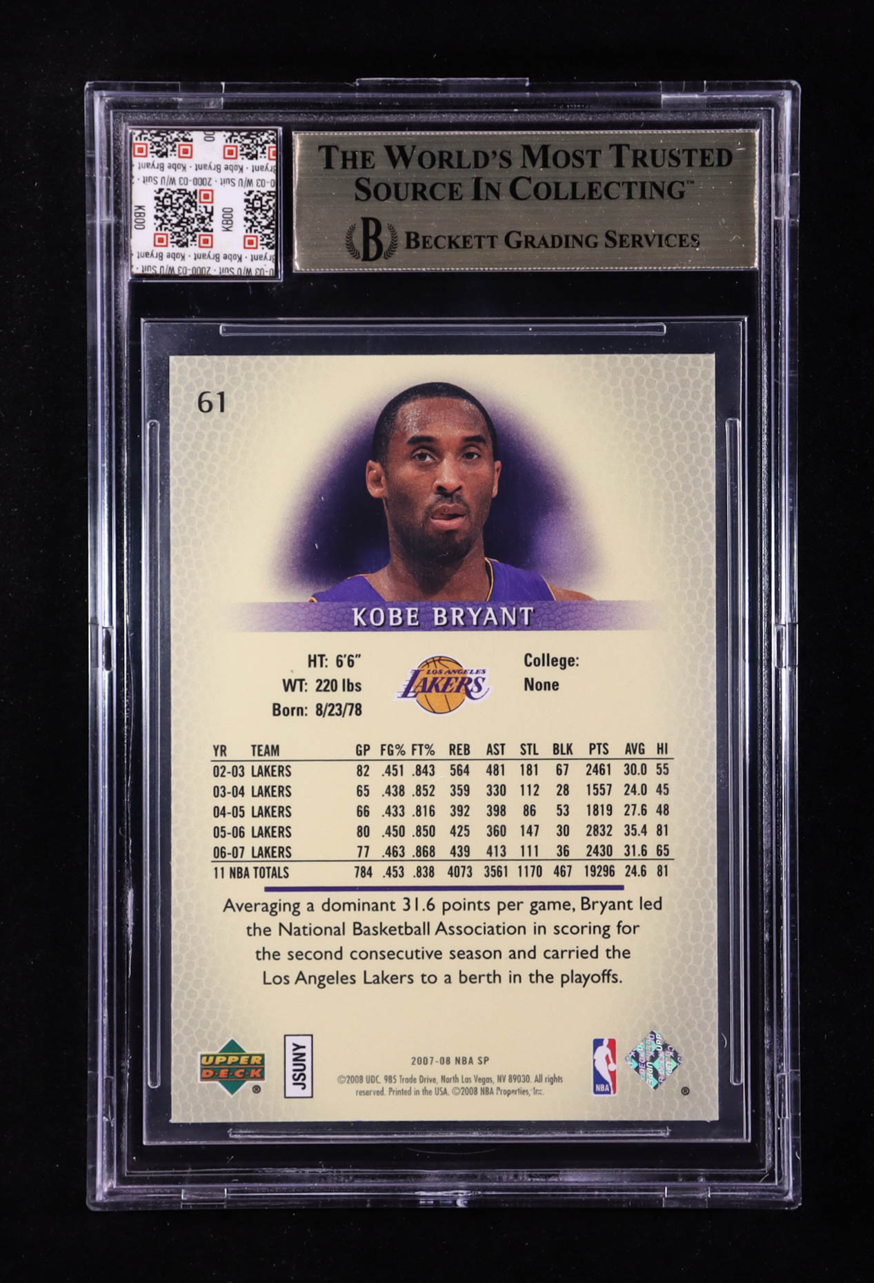 Kobe Bryant 2007-08 SP Authentic Retail #61 With Warm-Up Suit Swatch (BGS 9.5)