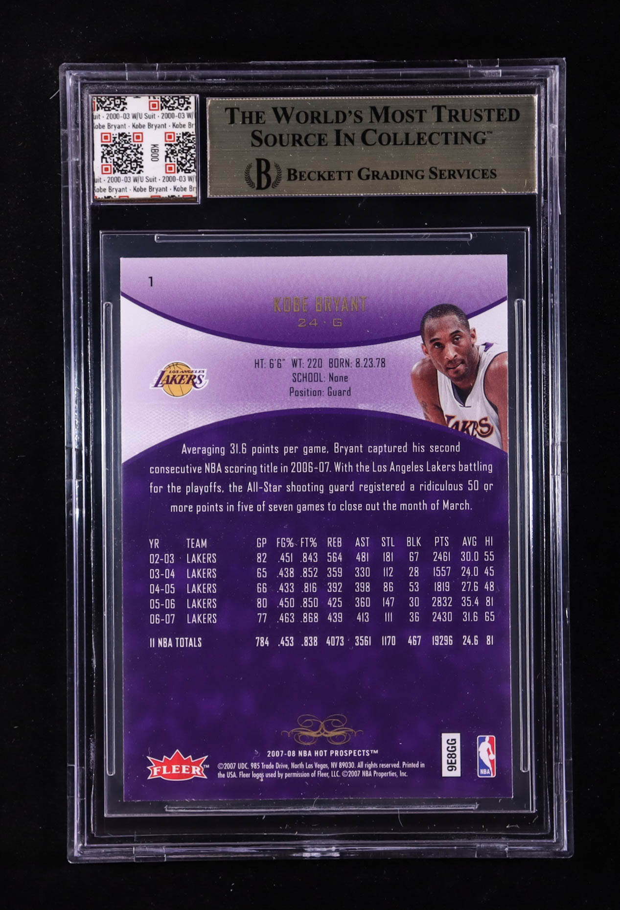 Kobe Bryant 2007-08 Fleer Hot Prospects #1 With Warm-Up Suit Swatch (BGS 9.5)