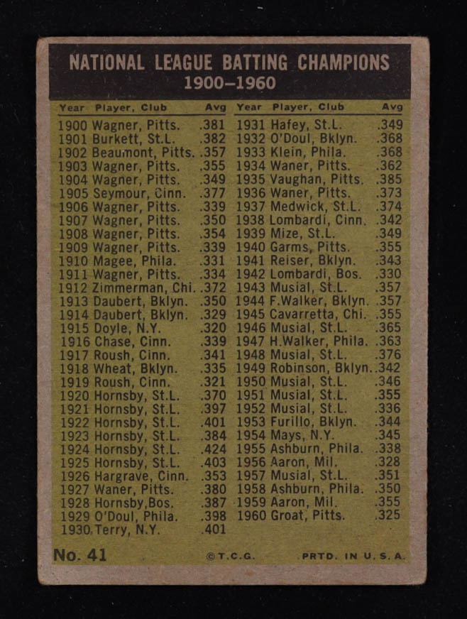 Dick Groat / Norm Larker / Willie Mays / Roberto Clemente 1961 Topps #41 NL Batting Leaders