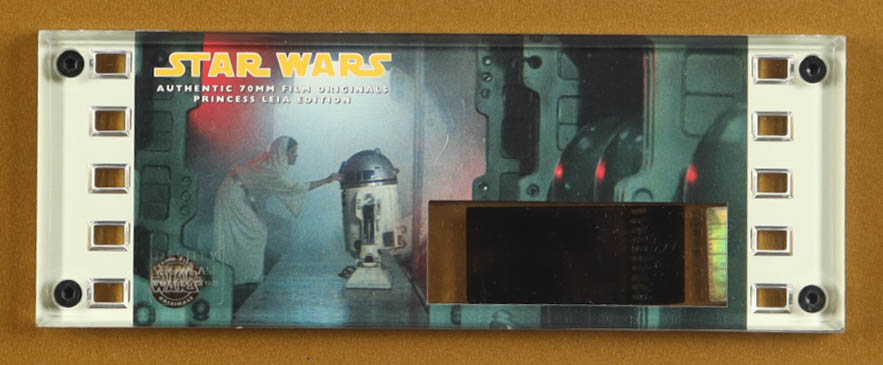Custom frame measures 13" x 23" in size and features a print of "Star Wars" as well as an Original 1977 70mm Film Cell with Star Wars Hologram. Please note that the item is unsigned.