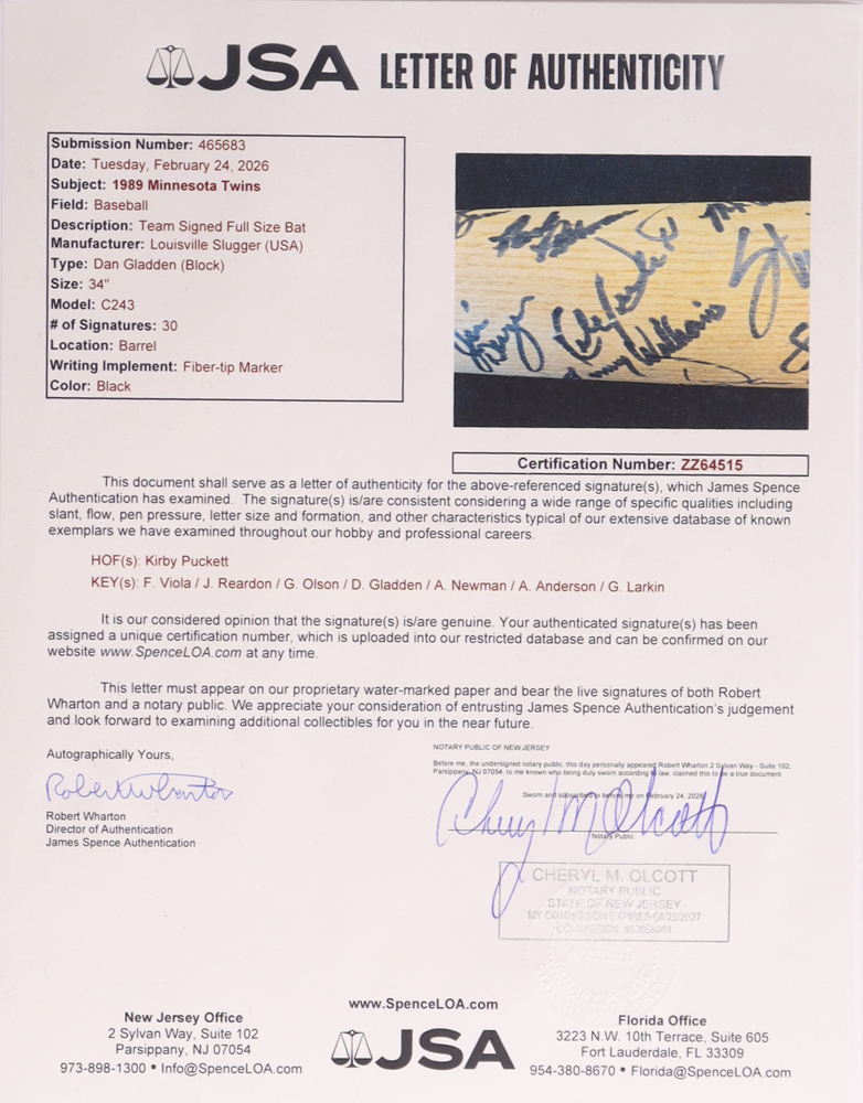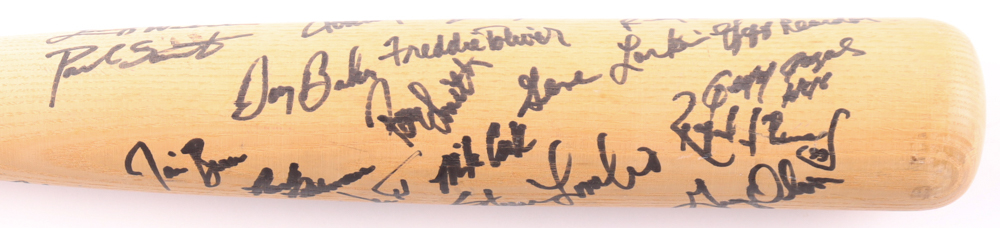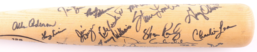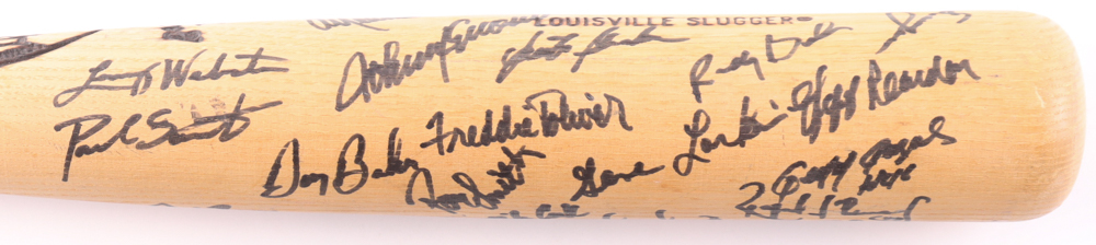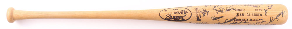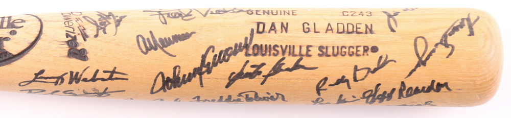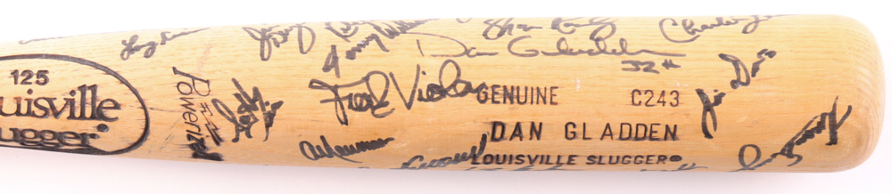 Louisville Slugger Powerized Dan Gladden model baseball bat. Hand-signed by (30) with include Kirby Puckett, Frank Viola, Jeff Reardon, Greg Olson, Dan Gladden, Al Newman, Allan Anderson, Gene Larkin and (22) others (Minnesota Twins). Please note, there is some scuffing on the bat.