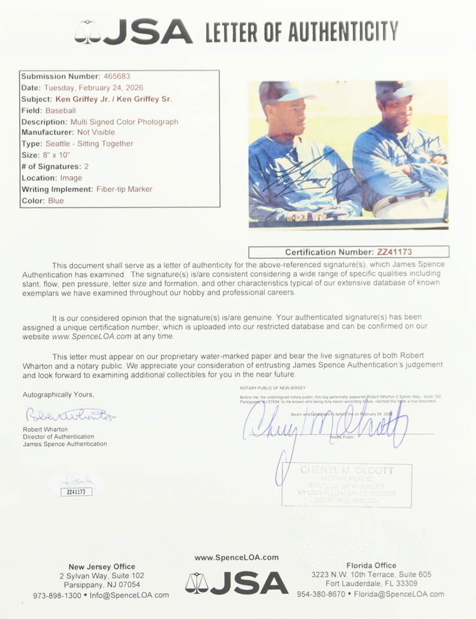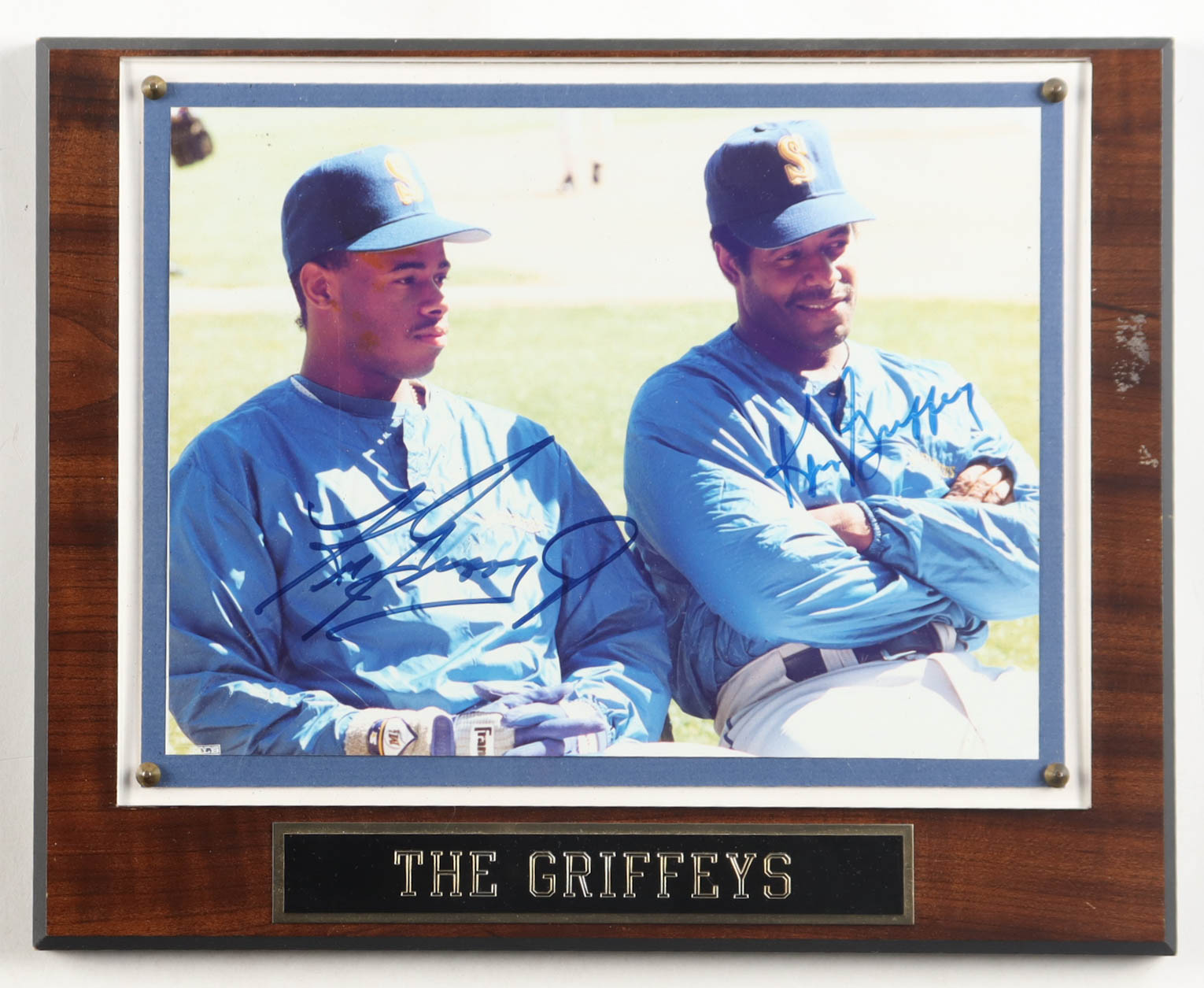 Custom plaque measures 10.5" x 13" in size. Photograph is hand-signed by Ken Griffey Sr. and Ken Griffey Jr. (Seattle Mariners).