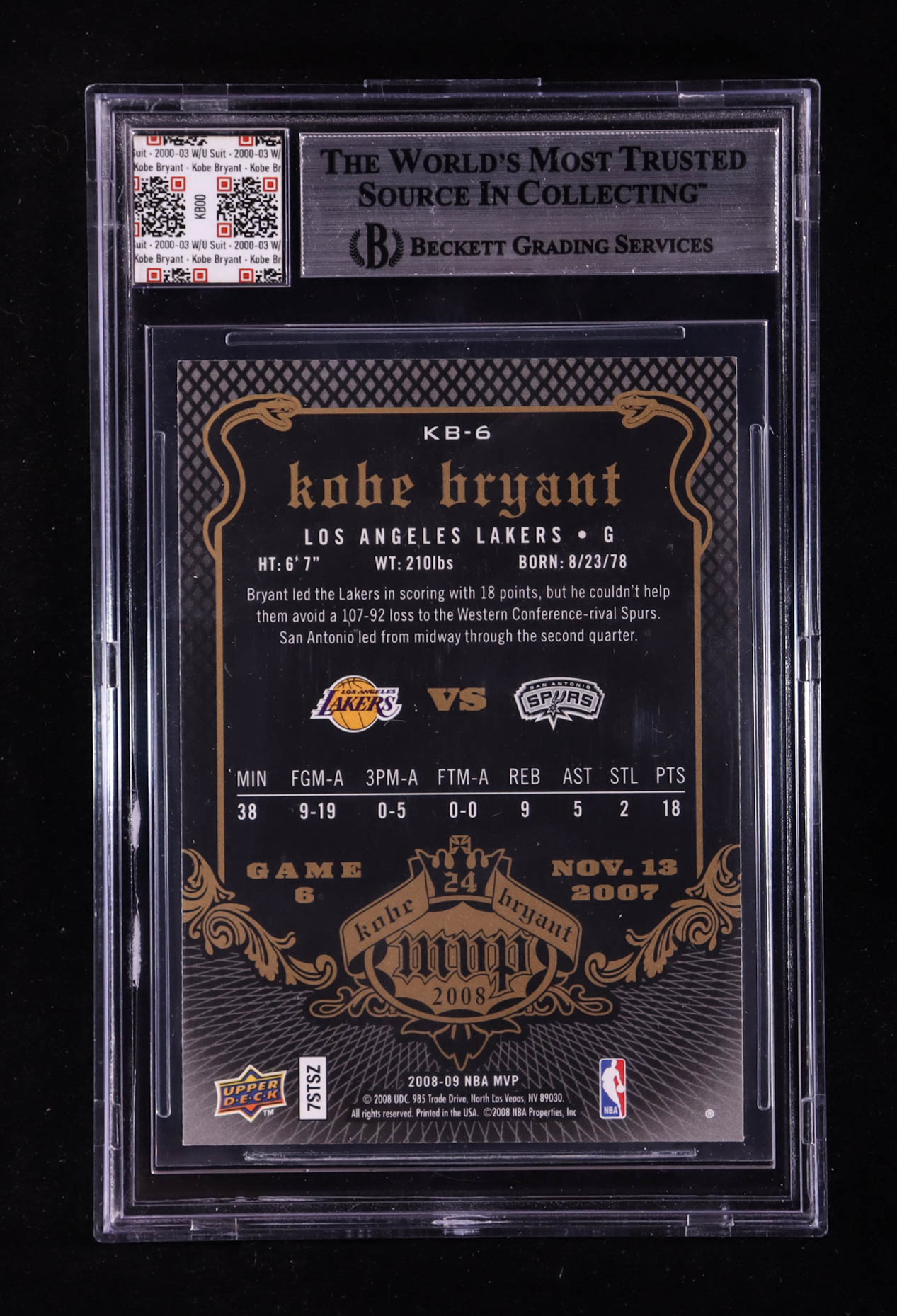 Kobe Bryant 2008-09 Upper Deck MVP Kobe MVP #KB6 With Warm-Up Suit Swatch (BGS)