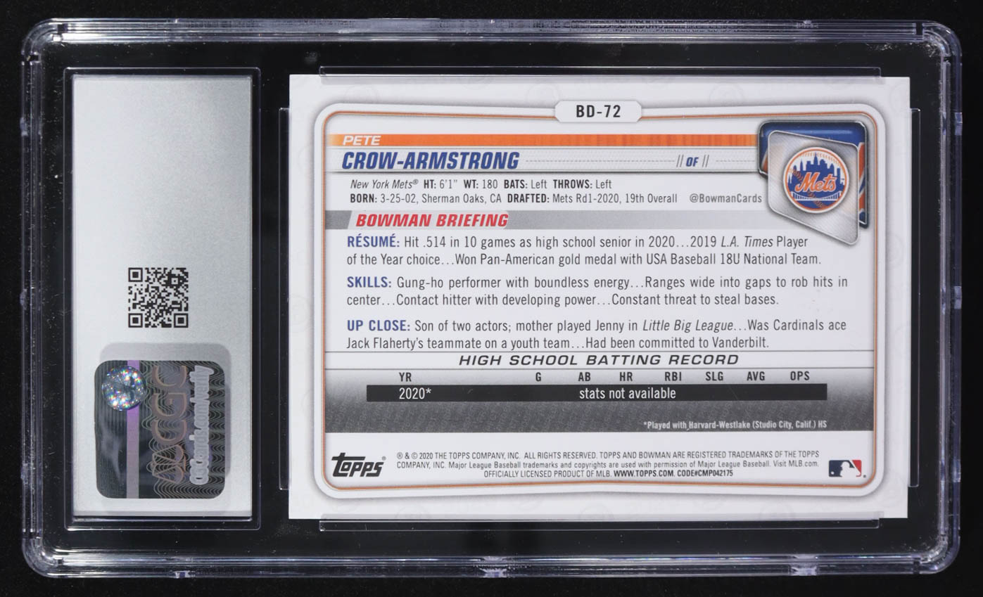 Pete Crow-Armstrong 2020 Bowman Draft #BD-72 RC (CGC 10)