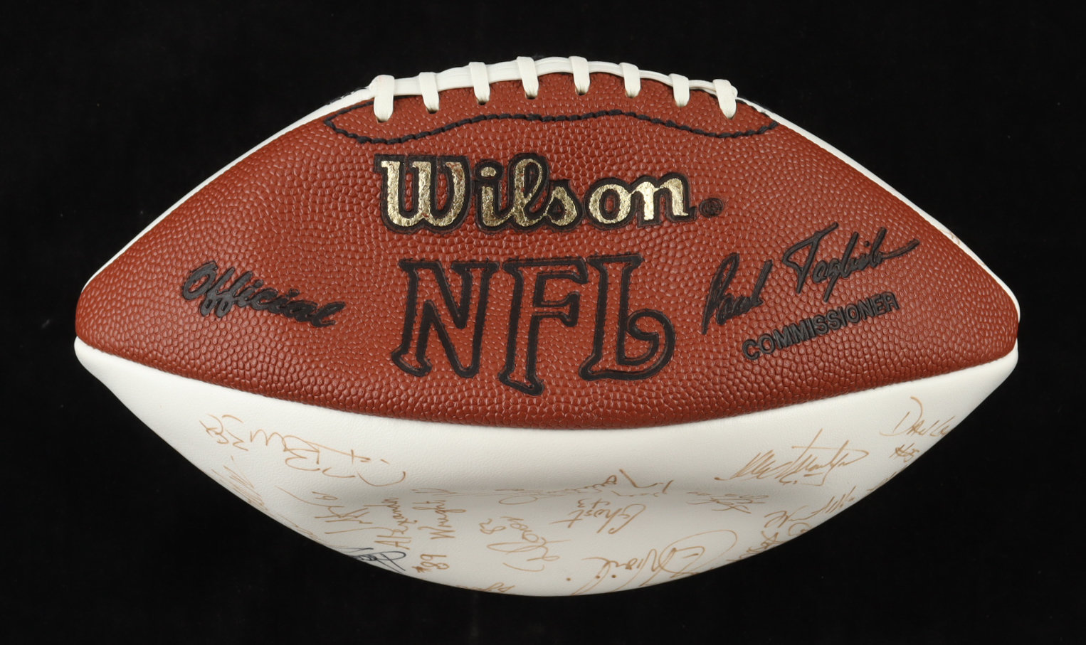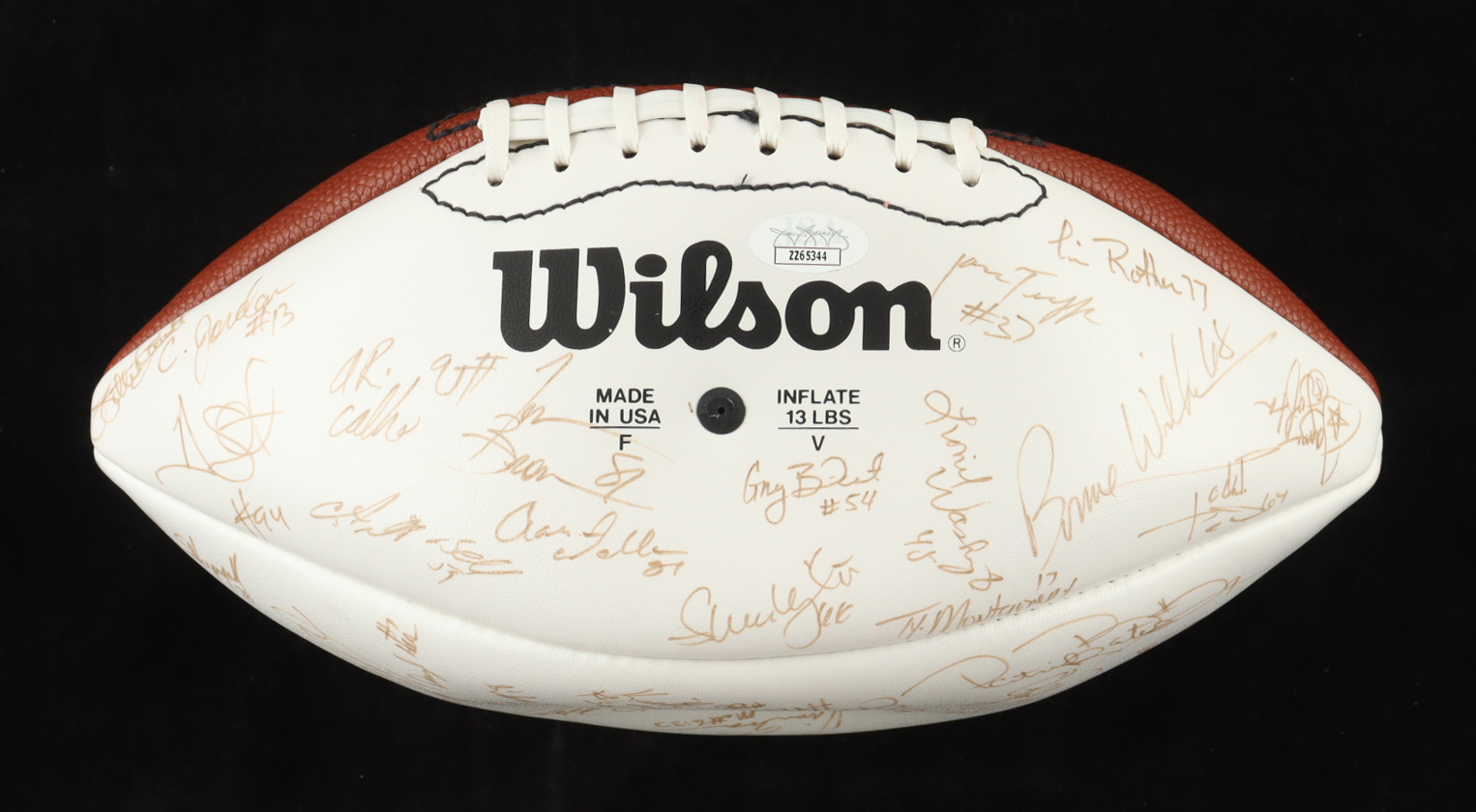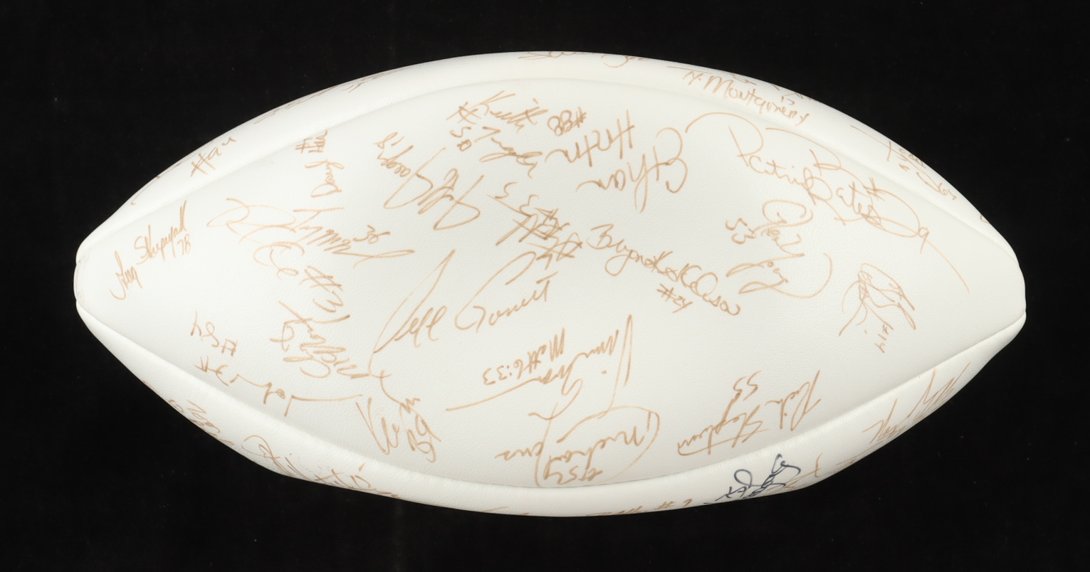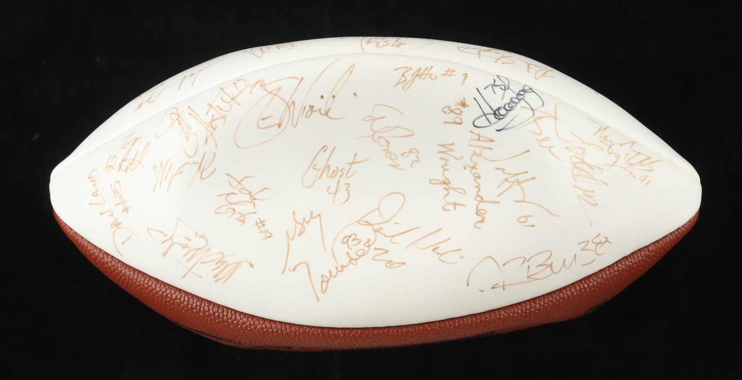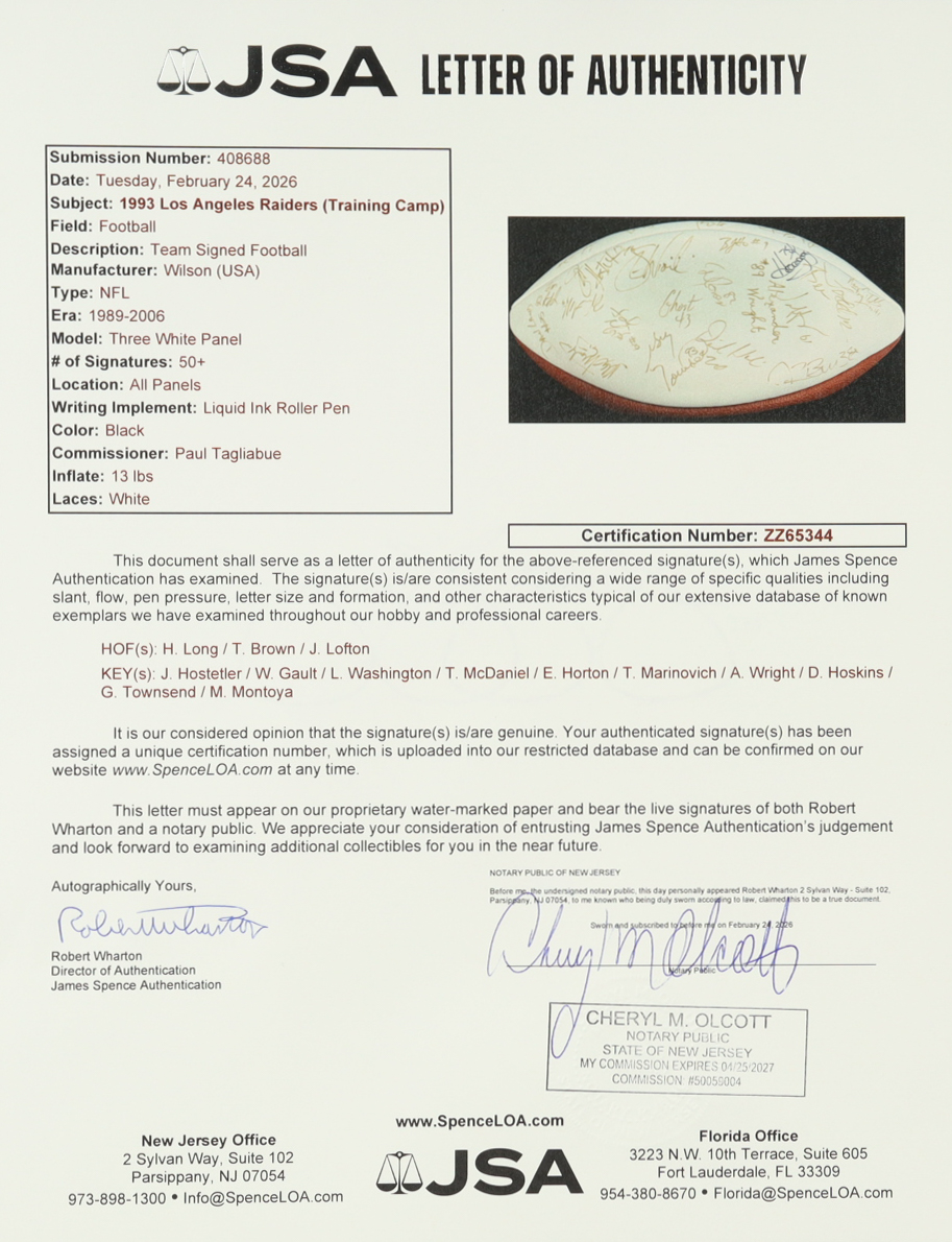 Wilson Official NFL football. Hand-signed by (50+) members of the 1993 Los Angeles Raiders training camp: Howie Long, Tim Brown, James Lofton, Jeff Hostetler, Willie Gault, Lionel Washington, Tim McDaniel, Eric Horton, Todd Marinovich, Anthony Wright, David Hoskins, Greg Townsend, Max Montoya and (40+) other unknown players. Please note the signatures are faint and have bled, and the ball will not hold air.