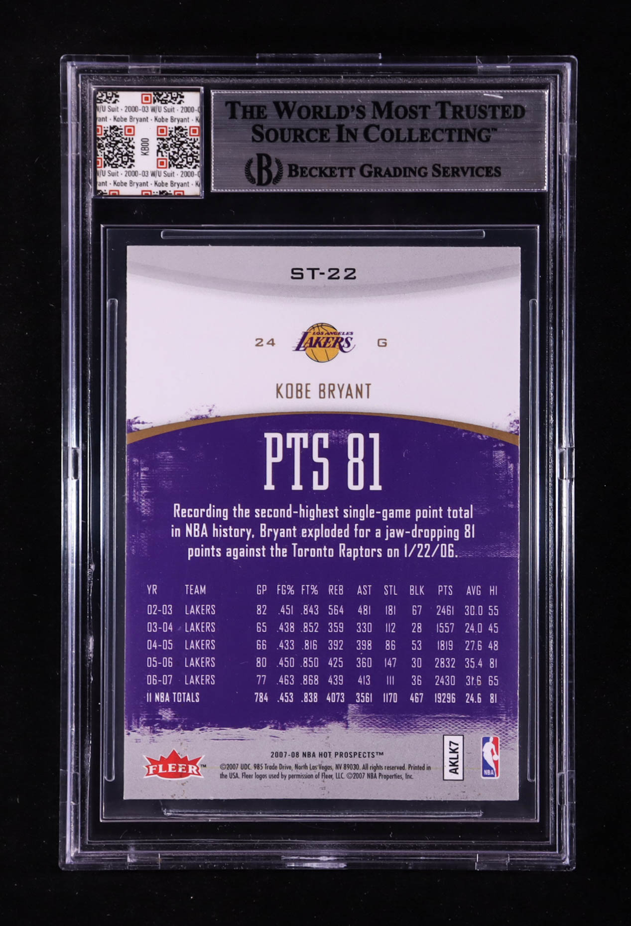 Kobe Bryant 2007-08 Fleer Hot Prospects Stat Tracker #22 With Warm-Up Suit Swatch (BGS)