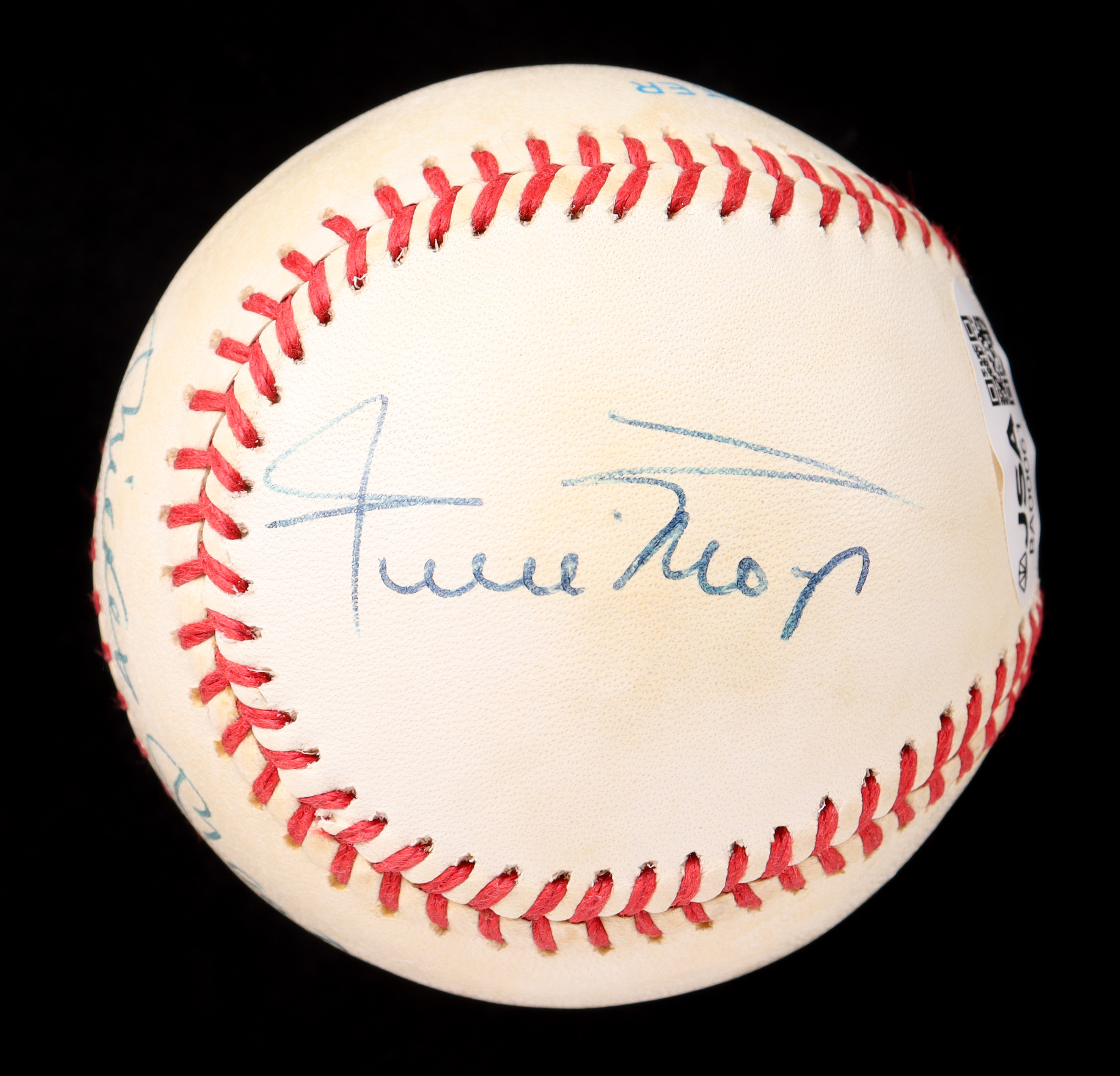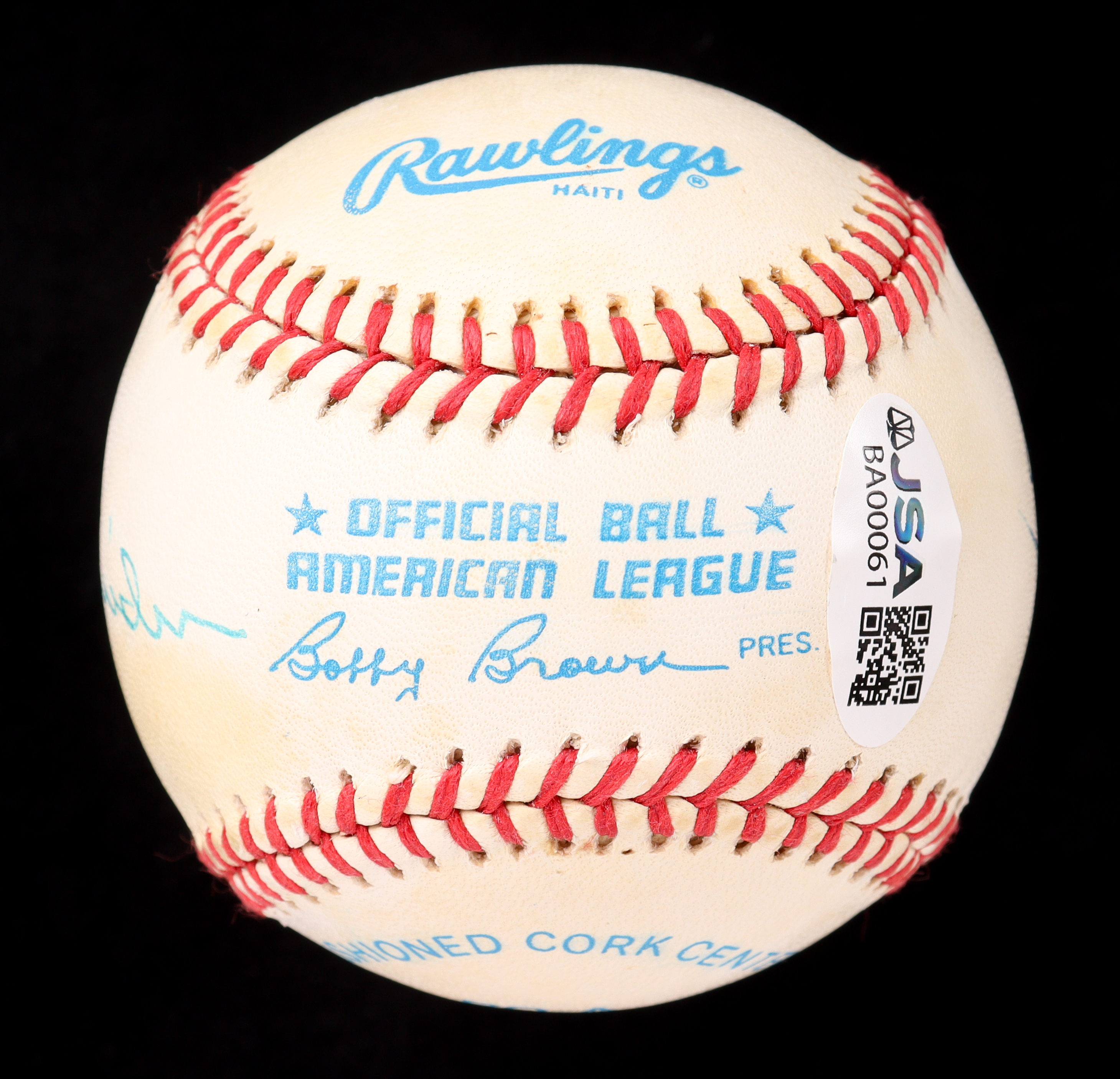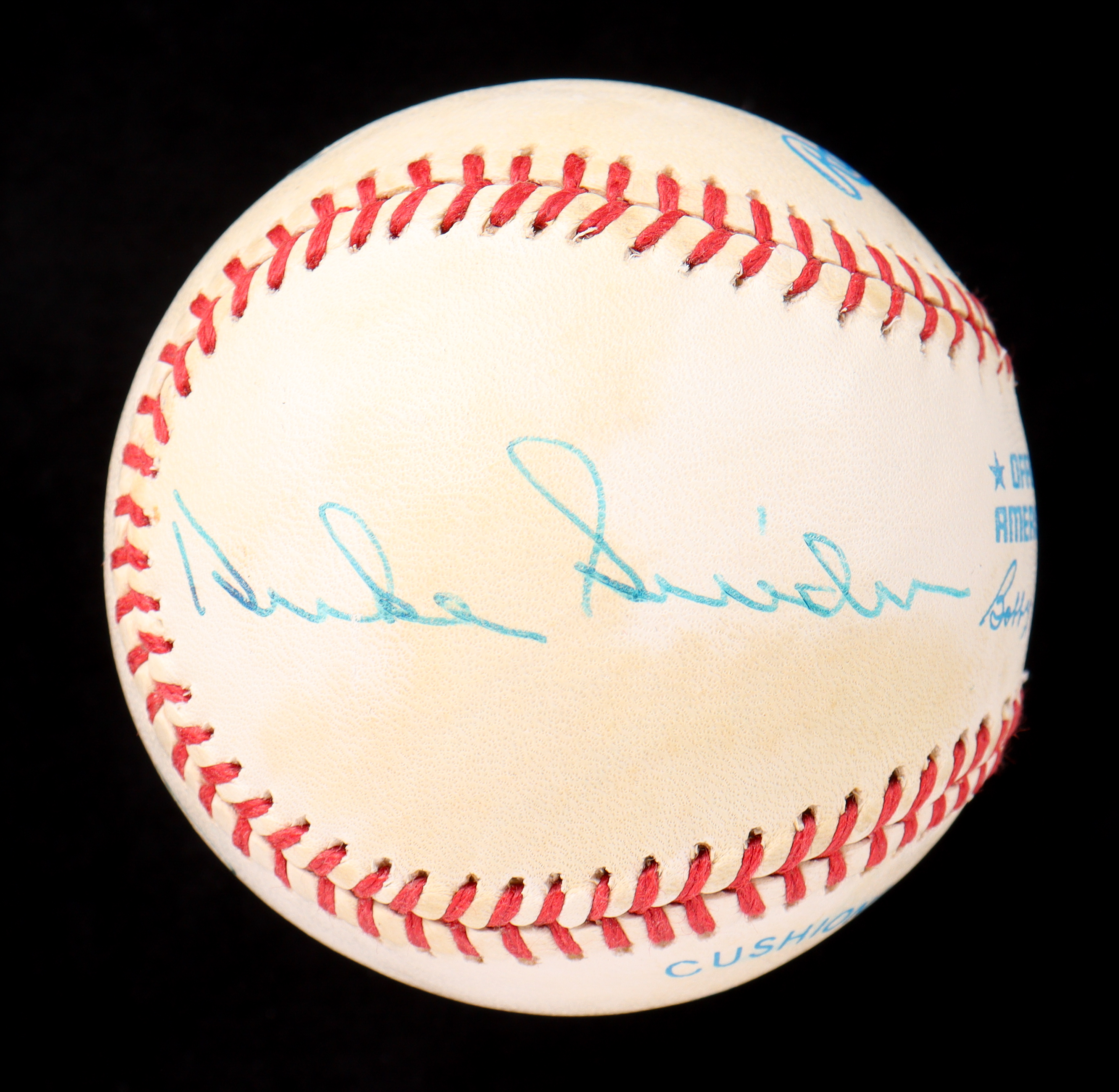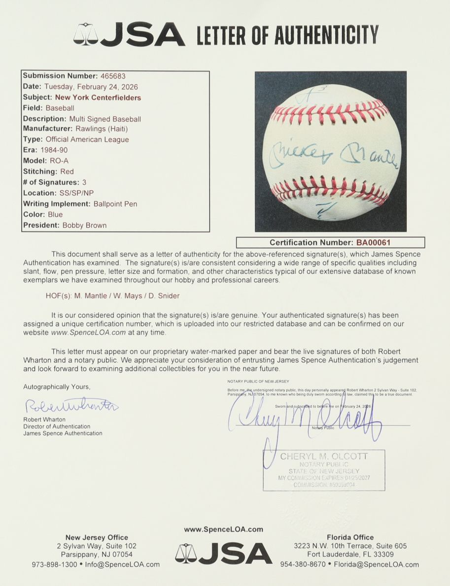 Rawlings Official American League baseball has been hand-signed by Mickey Mantle (New York Yankees), Willie Mays (San Francisco Giants), and Duke Snider (Los Angeles Dodgers). Please note, the baseball is stained and naturally toned.
