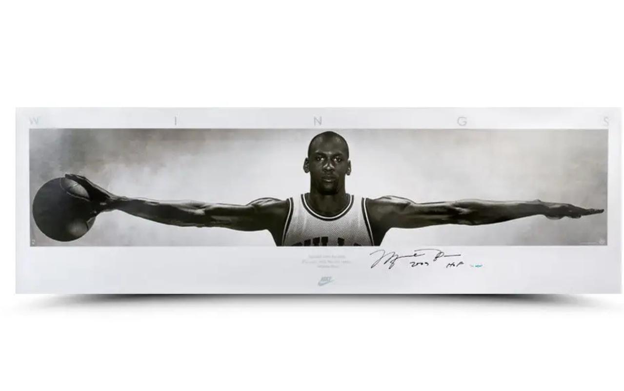 The NBA of the 1980s and '90s featured the marketing of its players through unique ad campaigns like posters. The themes were original and catchy, oftentimes showcasing a player's natural talent in a unique setting. Nike broke the mold when it featured an outstretched Michael Jordan and coupled that image with a quote from poet William Blake ('No bird soars too high, If he soars with his own wings') in its classic 'Wings' poster. The poster remains a cultural icon so Upper Deck Authenticated added a twist with a Jordan autograph and a Hall of Fame inscription. The print measures an impressive 72" x 23" and is the envy of every wall it adorns. Jordan has autographed and inscribed '2009 HOF' on this limited edition (123) 'Wings' designed print in black paint pen. His signature is deemed authentic by virtue of Upper Deck Authenticated's Five-Step Process. Certified authentic with Upper Deck hologram and certificate