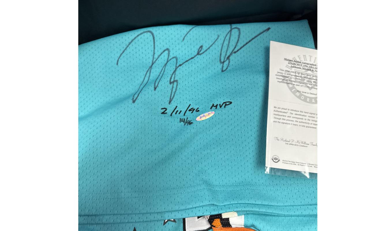 Mitchell & Ness jersey with everything sewn on, size XL. Hand-signed by Michael Jordan (Chicago Bulls, HOF). This jersey is limited edition and has been numbered #/96.