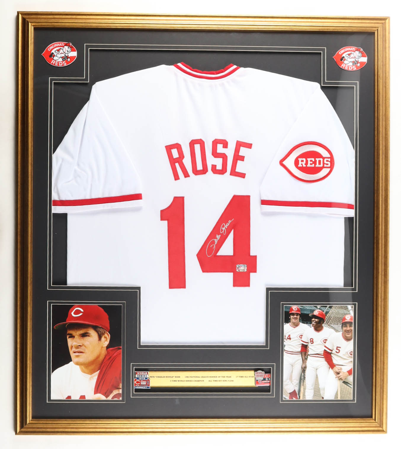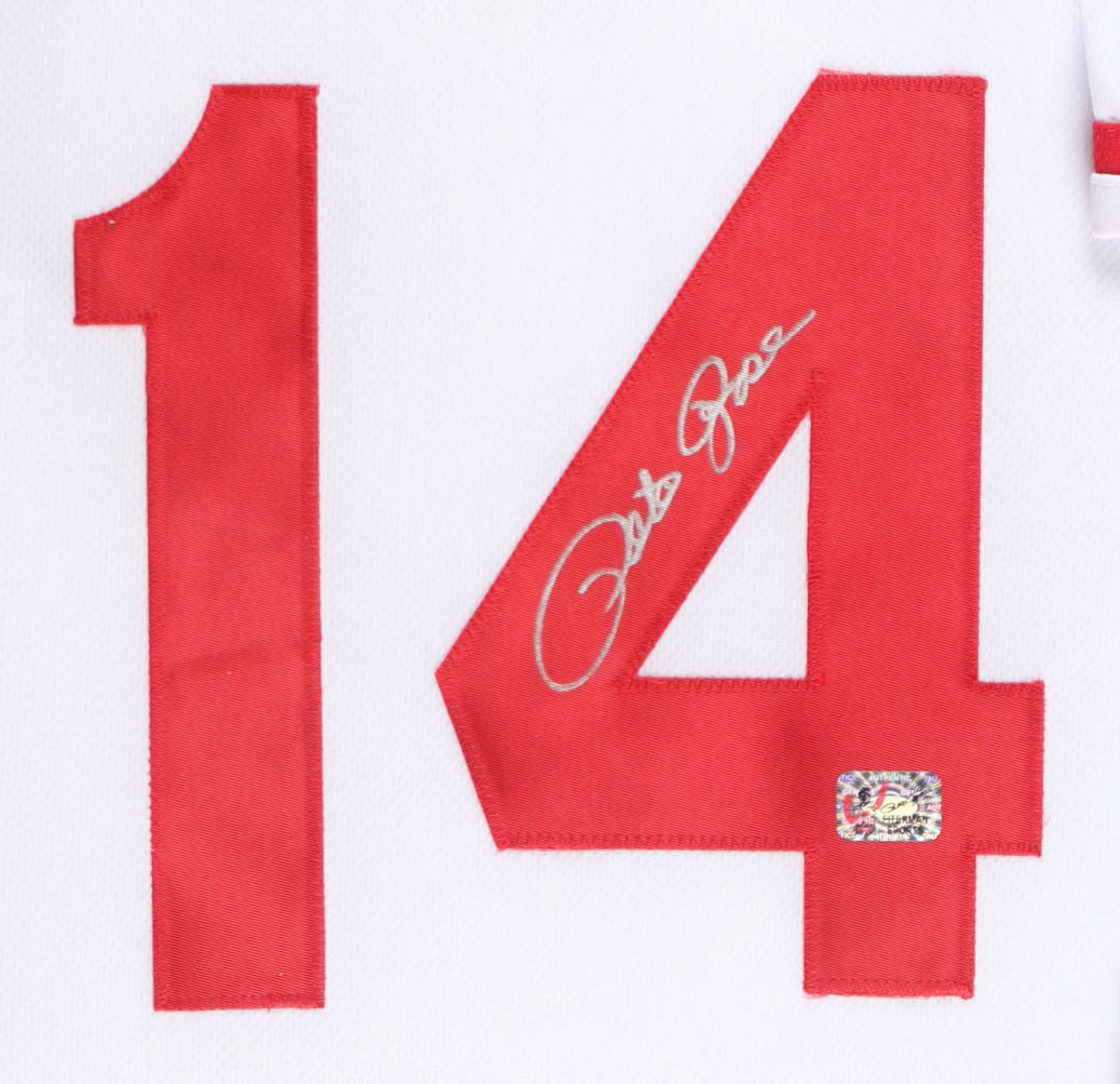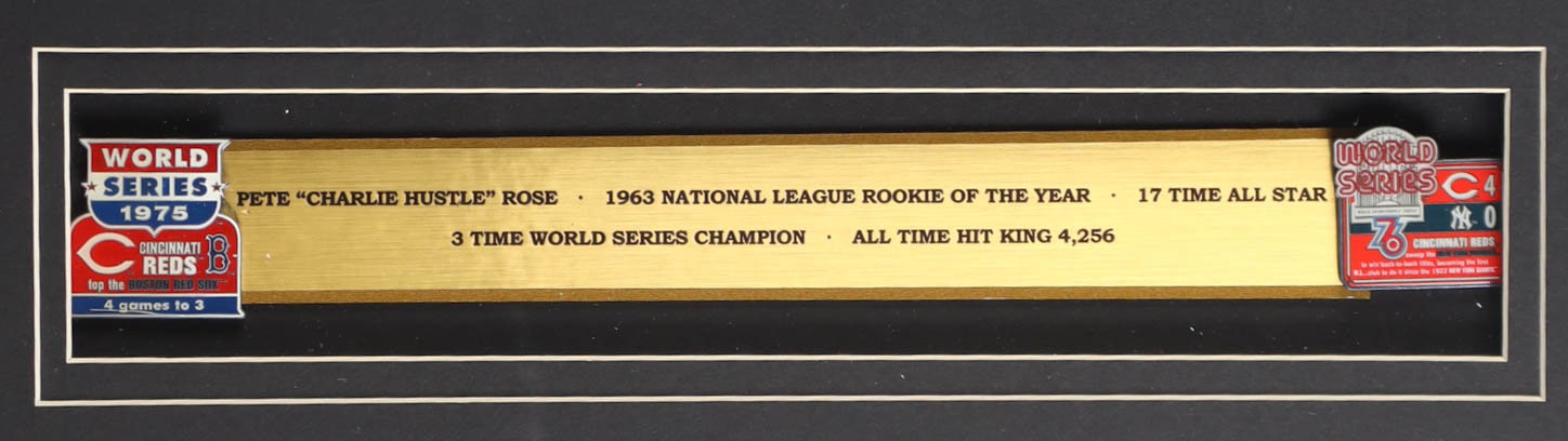 Pete Rose Signed Custom Framed Jersey Display with (2) World Series Pins & Statistics Plaque (Rose)