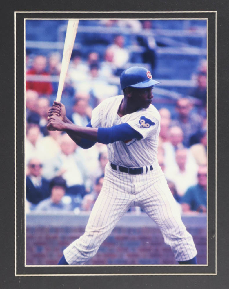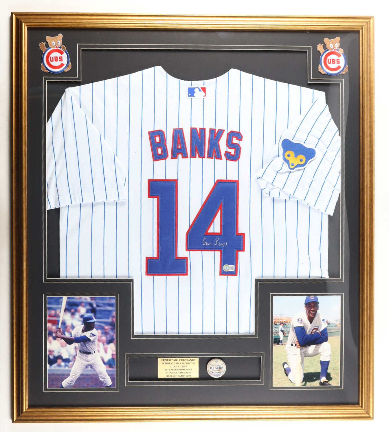 Custom frame display measures approximately 32" x 36" in size and features a jersey and a jersey that has been hand-signed by Ernie Banks (D. 2015, Chicago Cubs, HOF). The display also includes a National League All Stars Pin, (2) 8" x 10" photos and (2) cloth team logo patches as well as a career statistics plaque.