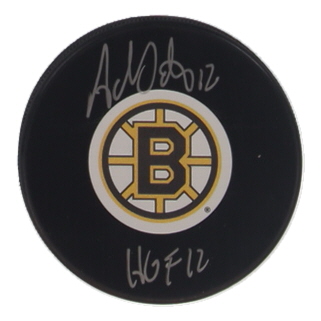 Boston Bruins logo hockey puck. Hand-signed and inscribed by Adam Oates (HOF).