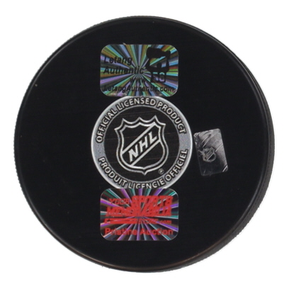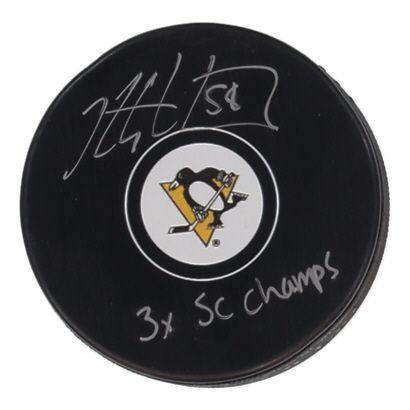 Pittsburgh Penguins logo hockey puck. Hand-signed and inscribed by Kris Letang.