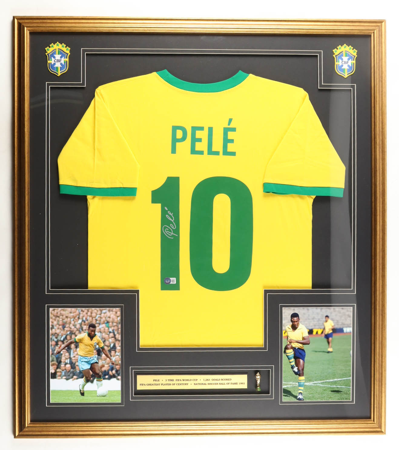 Pele Signed Custom Framed Jersey Display with Trophy Pin & Stat Plaque (Beckett)