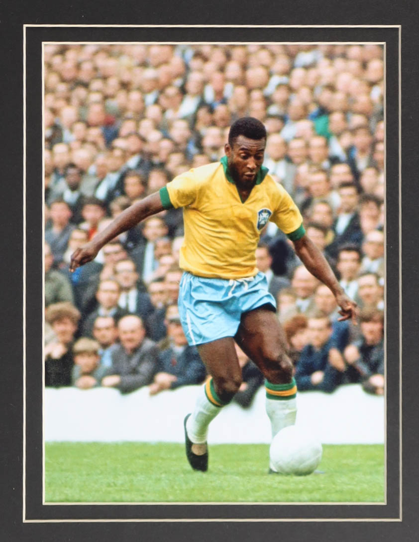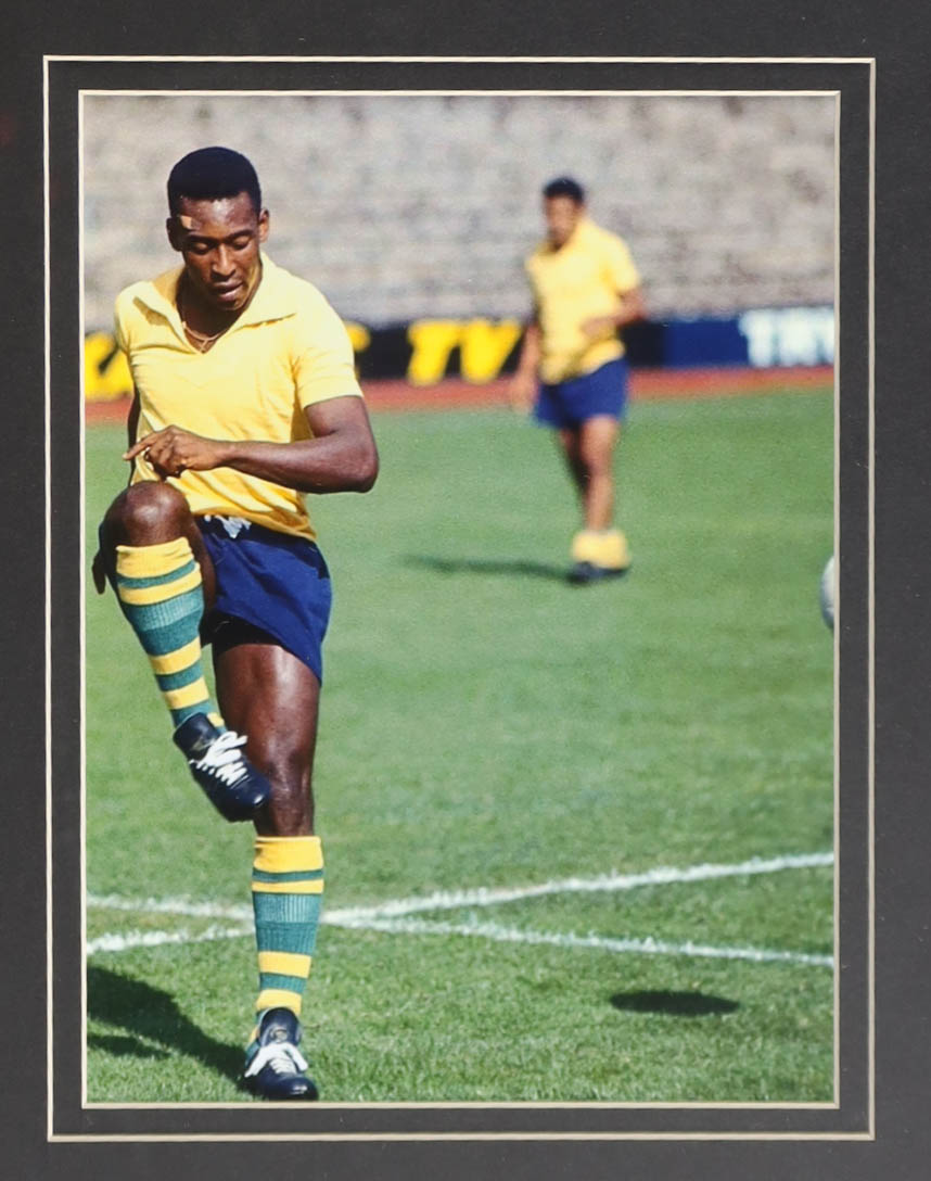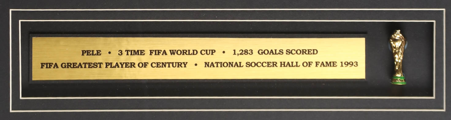 Custom frame measures 32" x 36" in size and features a jersey that has been hand-signed by Pele (D. 2022, HOF). Please note that the 8" x 10" photos may be in reverse order. Display also features a Trophy Pin and career statistics plaque and (2) cloth team logo patches.