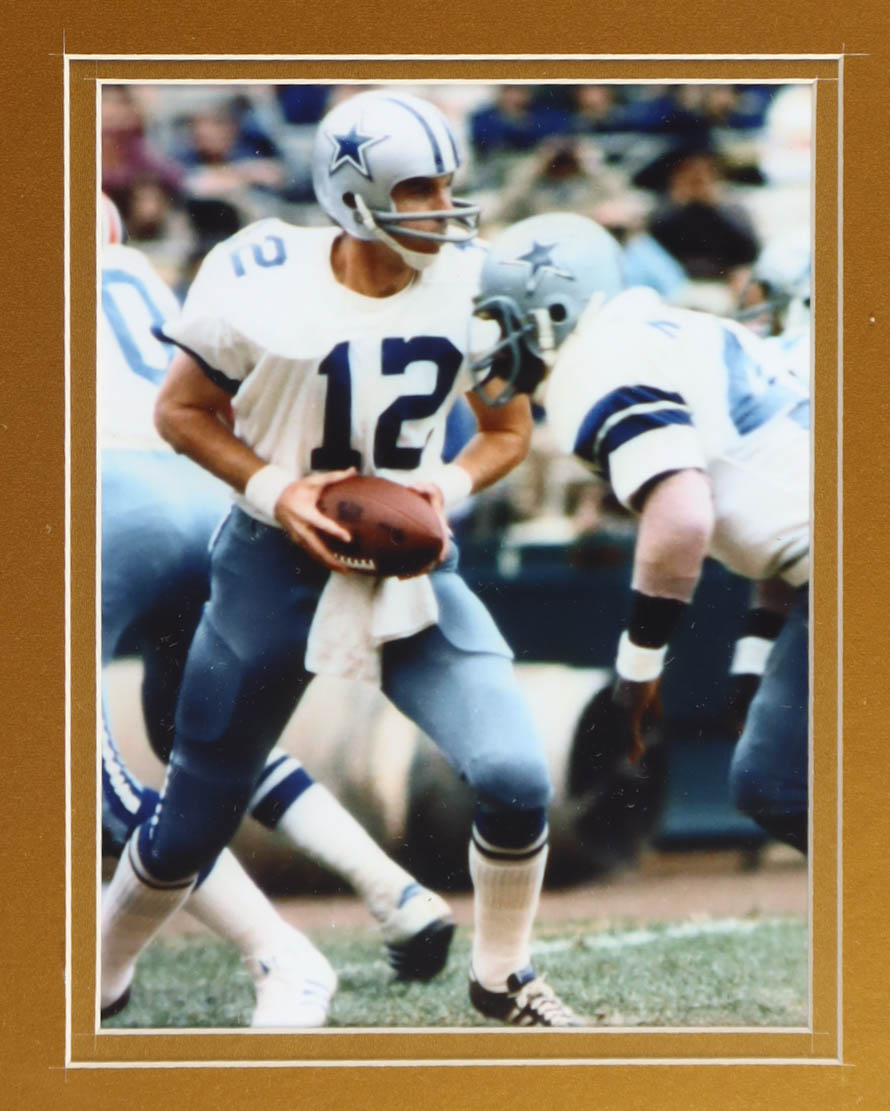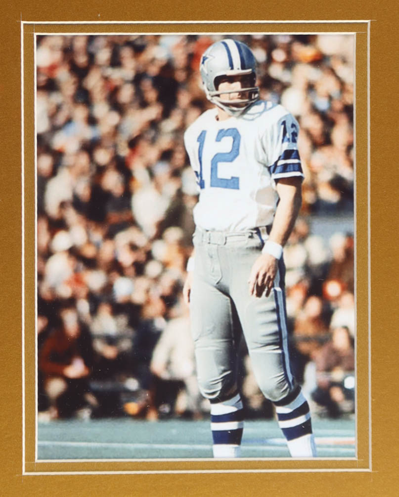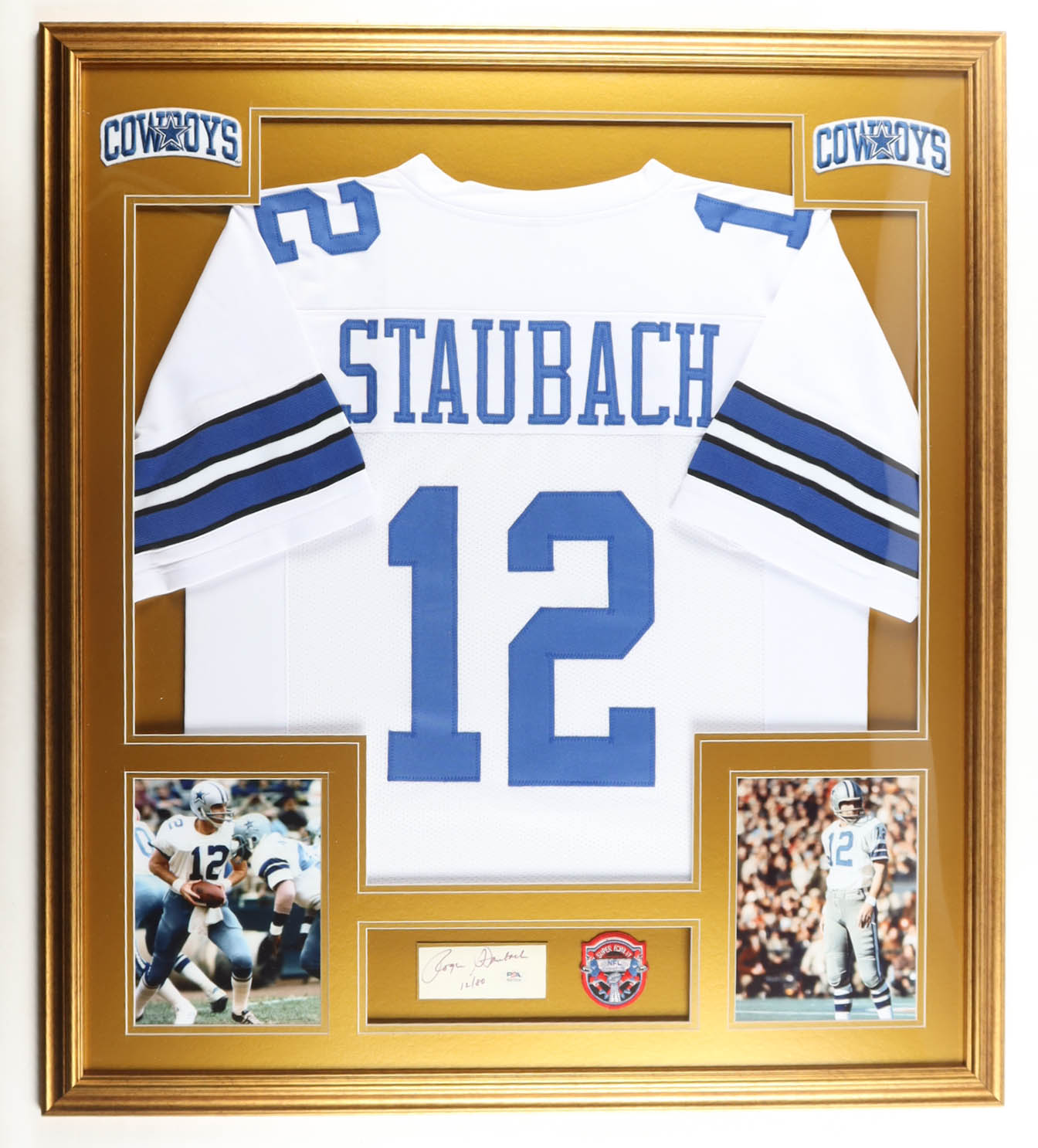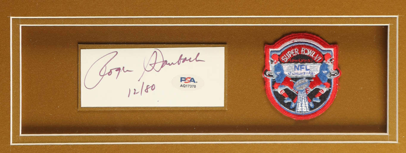 Custom frame measures approximately 32" x 36" in size and features a cut that has been hand-signed by Roger Staubach (HOF). The display also includes a vintage Super Bowl VI Patch, Unsigned Jersey, as well as (2) cloth team patches & 2 photos.