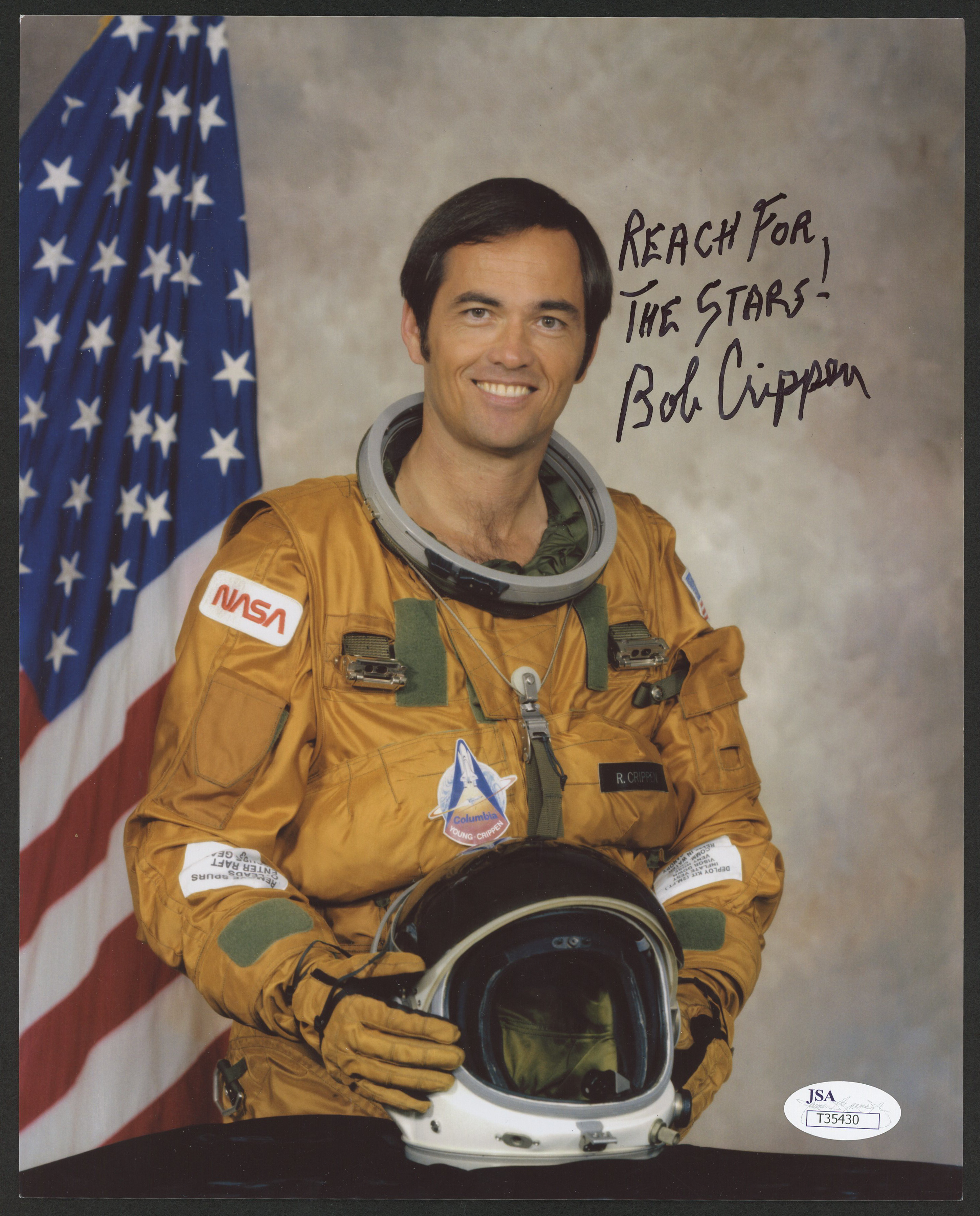Photo measures 8" x 10" in size and has been hand-signed and inscribed in black felt-tip pen by Robert Crippen. Please note, a personalization has been removed from the photo.