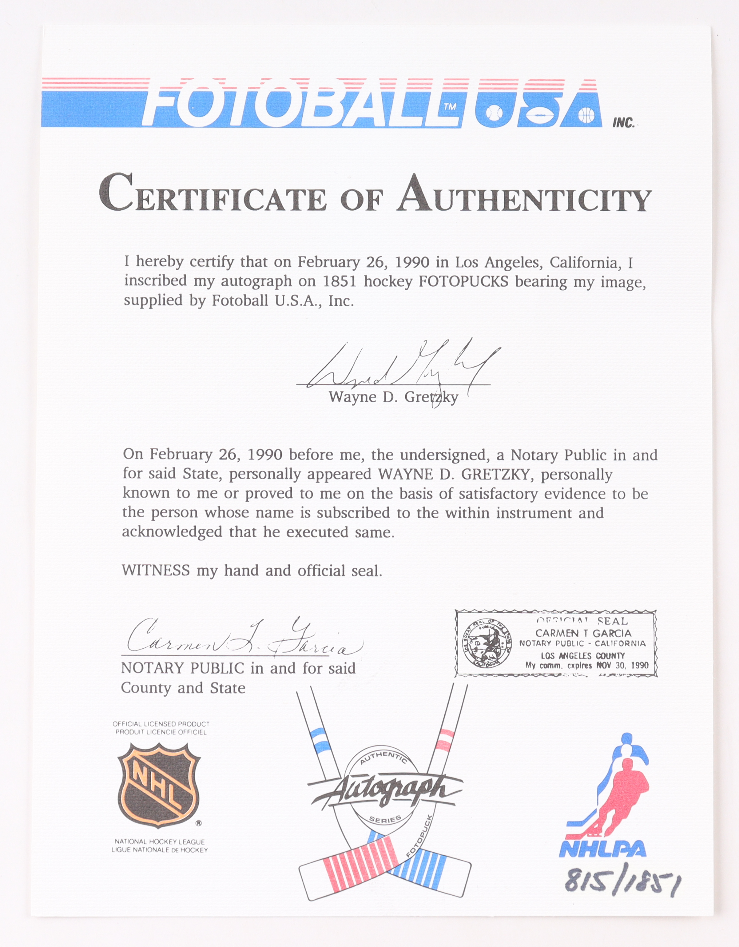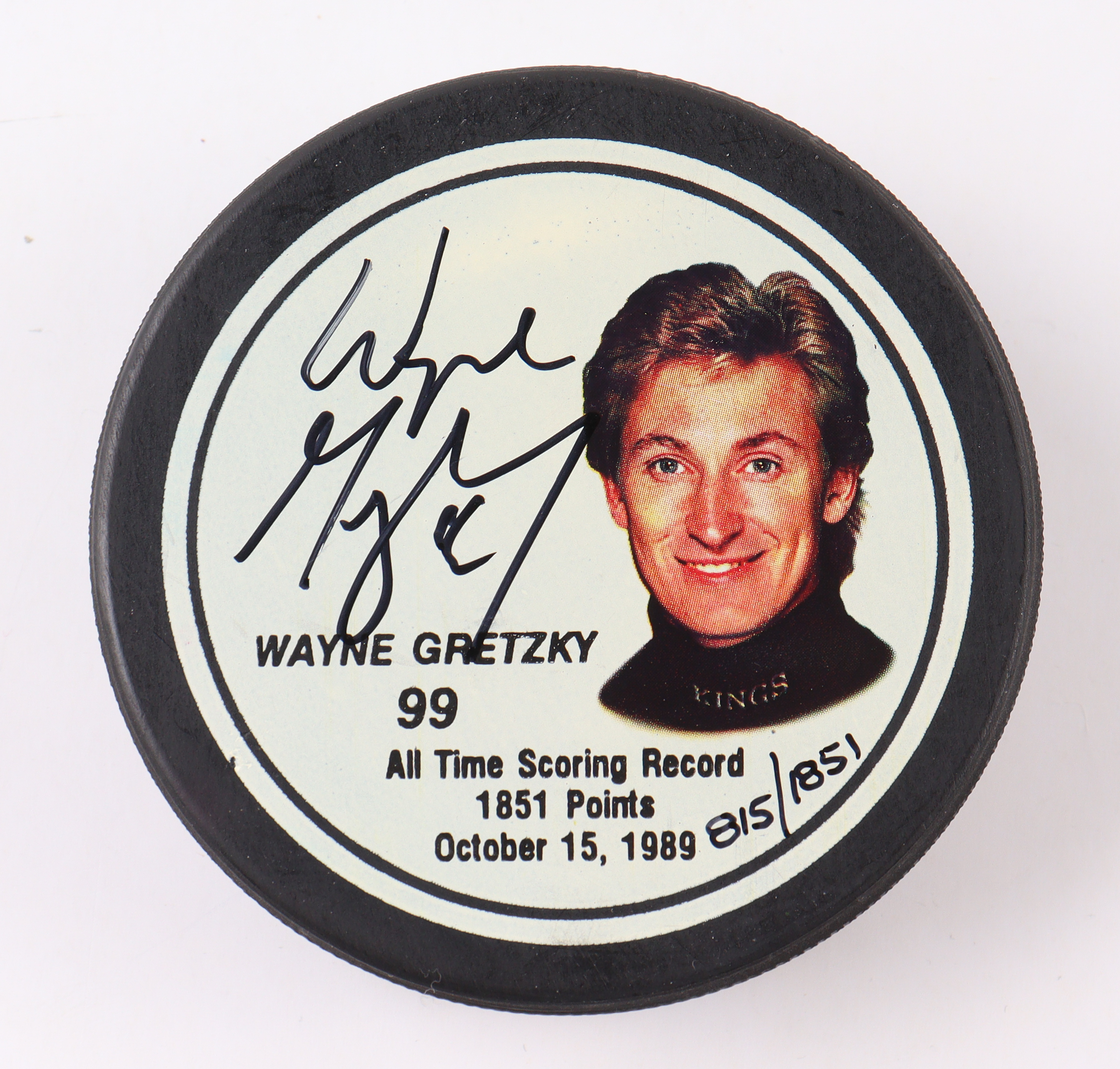 Los Angeles Kings "All-Time Scoring Record" image hockey puck has been hand-signed by Wayne Gretzky (HOF). This item is limited edition and has been numbered #815/1851. Display case included as shown.