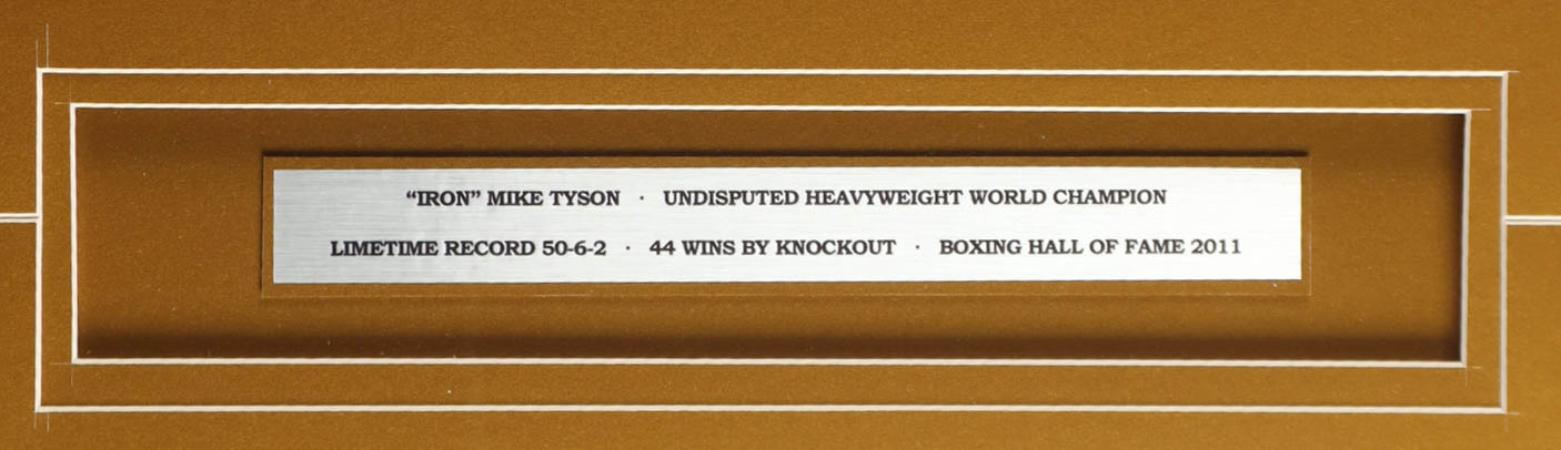 Custom frame measures 32" x 36" in size. Features a full career statistics plaque as well as a robe that has been hand-signed by Mike Tyson (HOF).