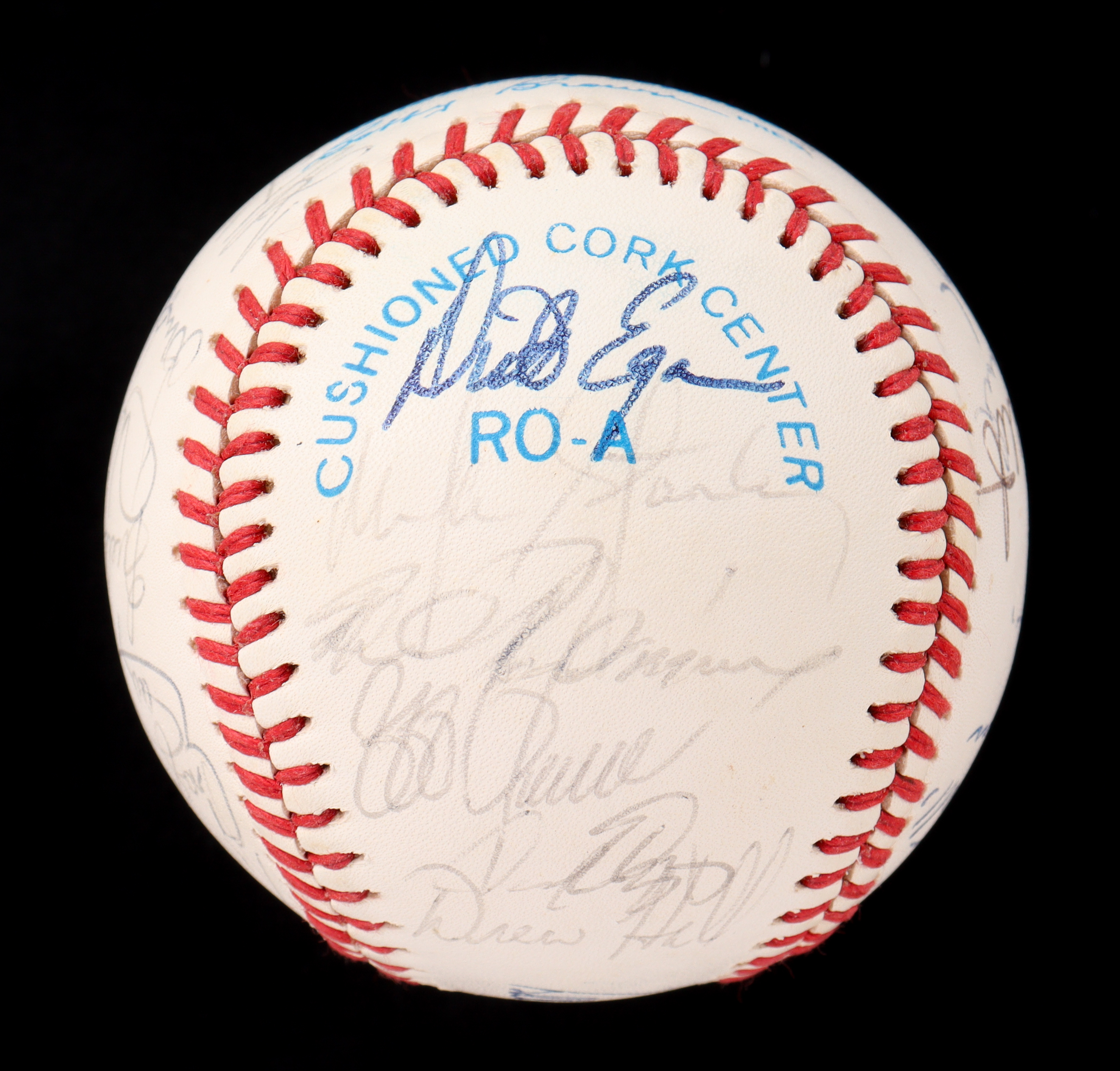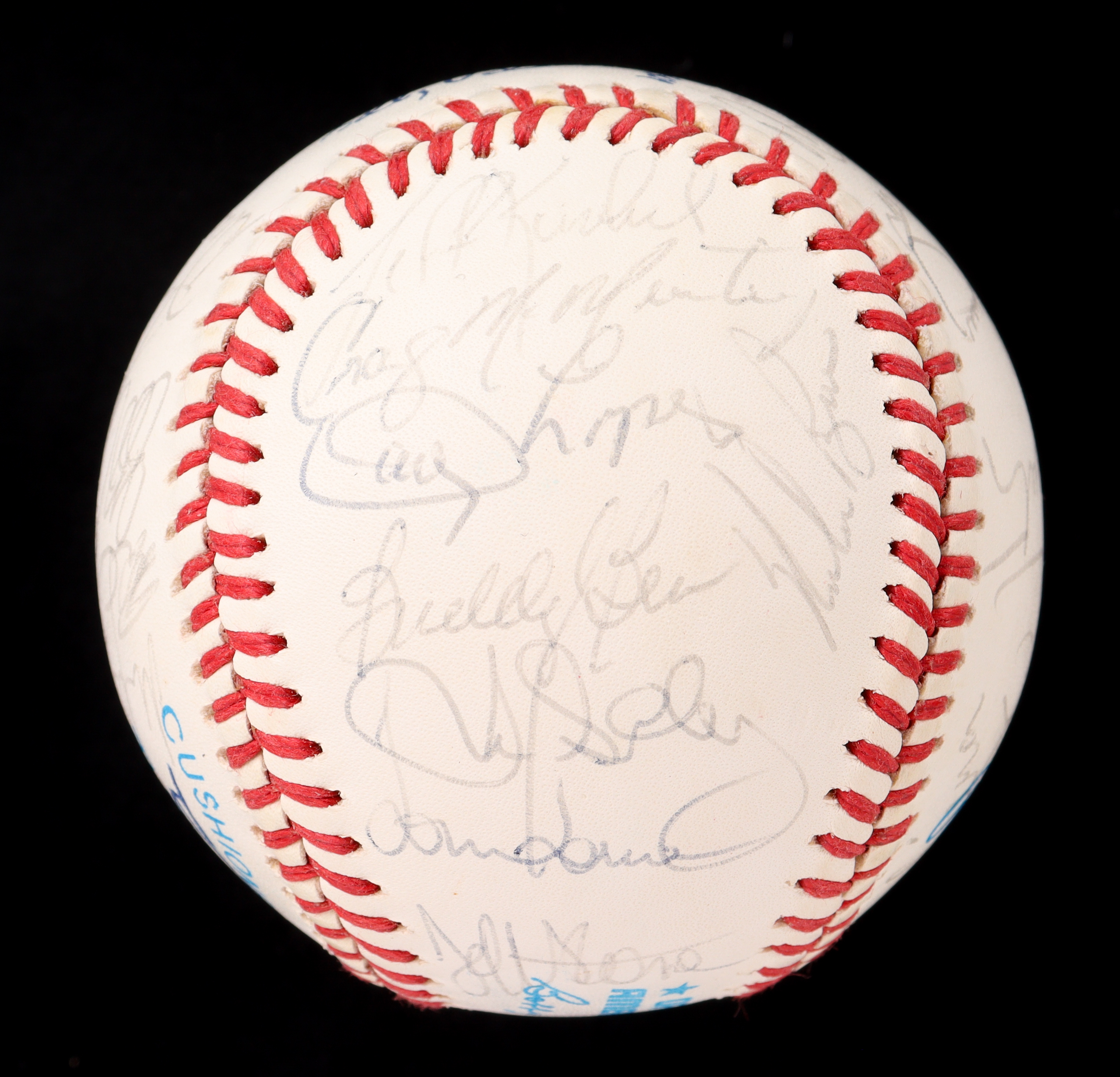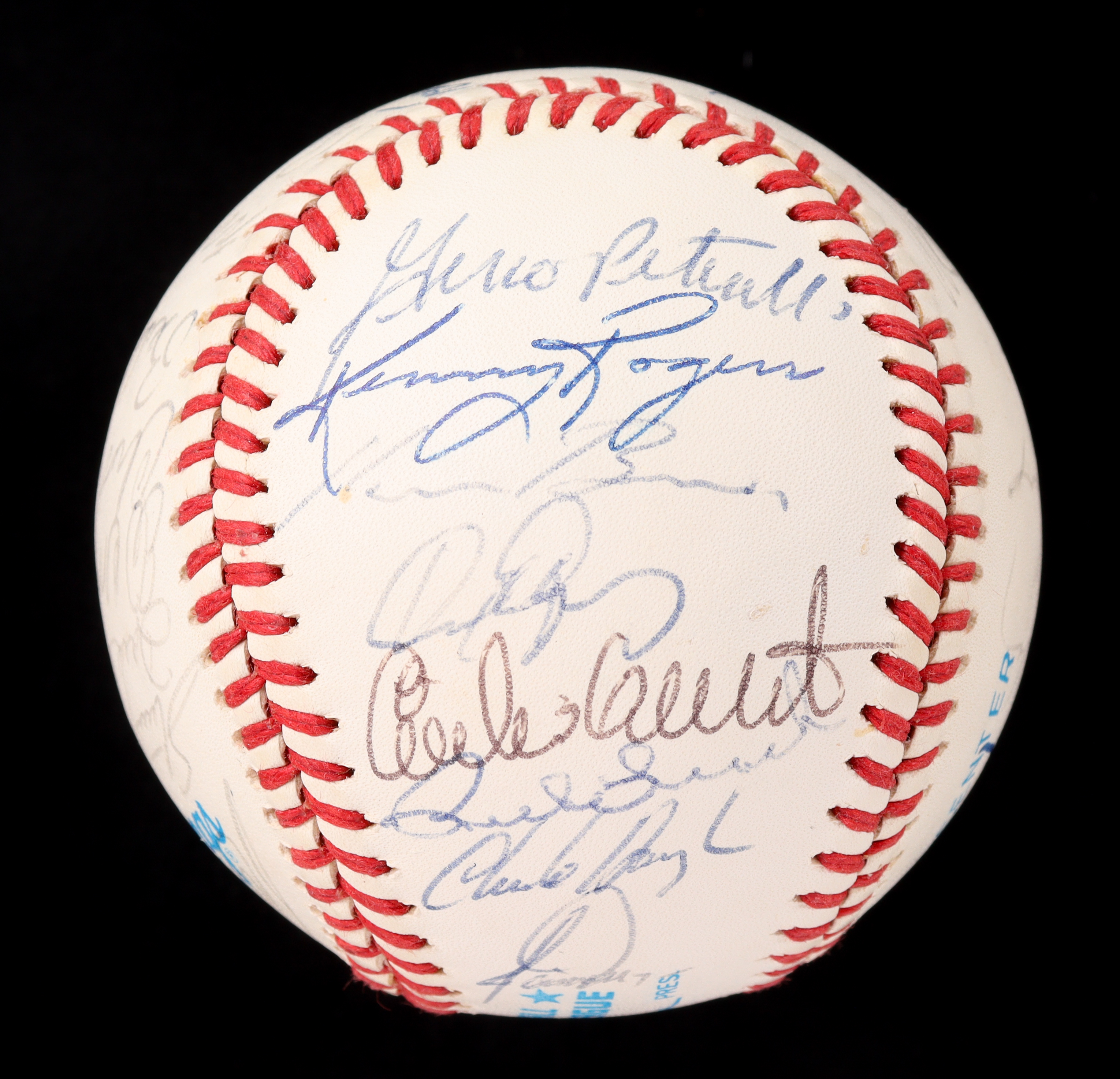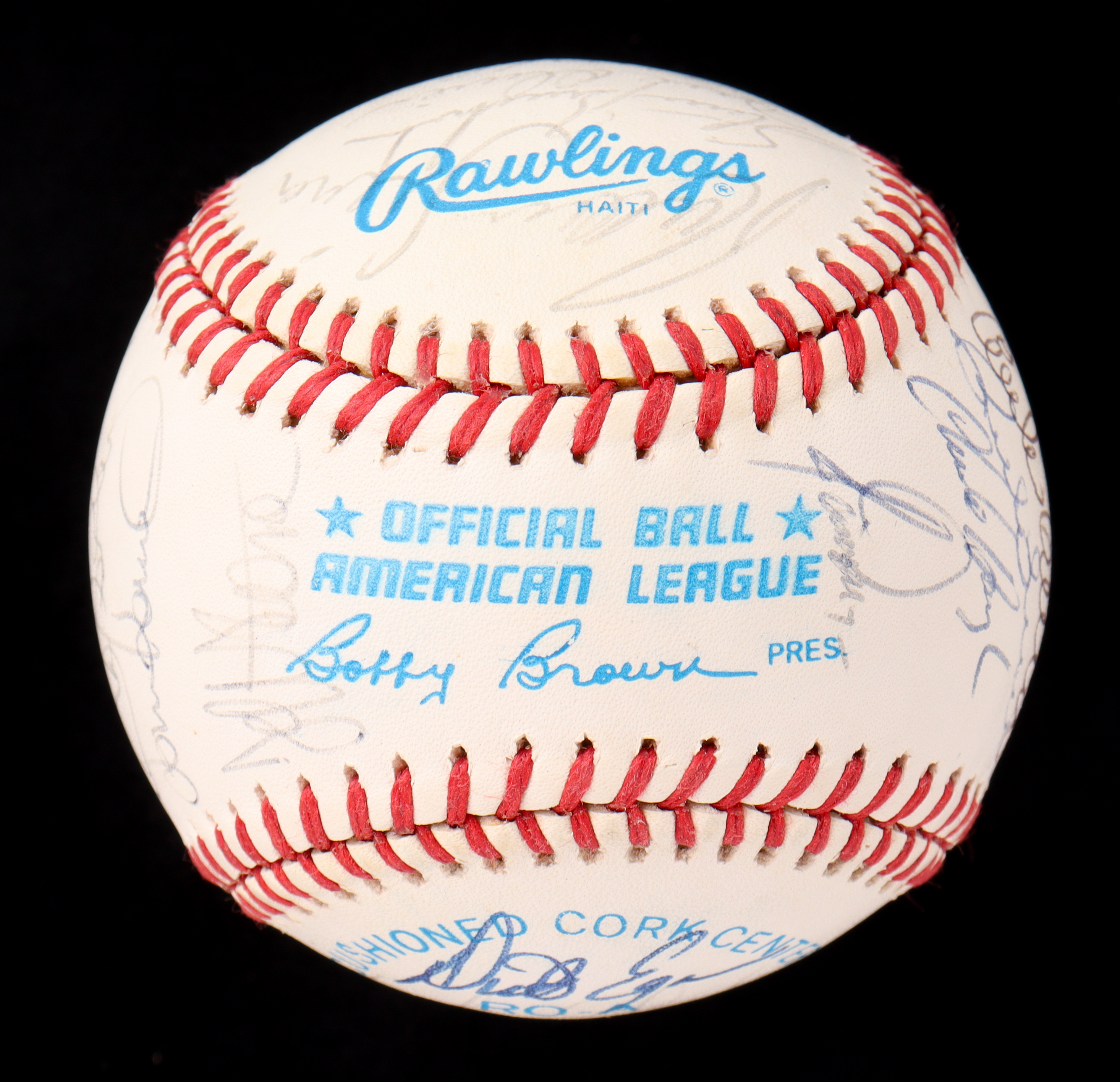 Rawlings Official American League baseball. Hand-signed by Nolan Ryan, Kevin Brown, Charlie Hough, Jim Moyer, Dave Lopes, Bobby Valentine, Rusty Palmiero, Bill Witt, Rubén Sierra, Kenny Rogers, Jeff Russell, and (21) more (Texas Rangers). See photos for more details.