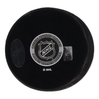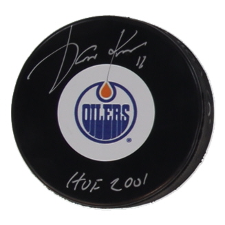 Edmonton Oilers logo hockey puck. Hand-signed and inscribed by Jari Kurri (HOF).