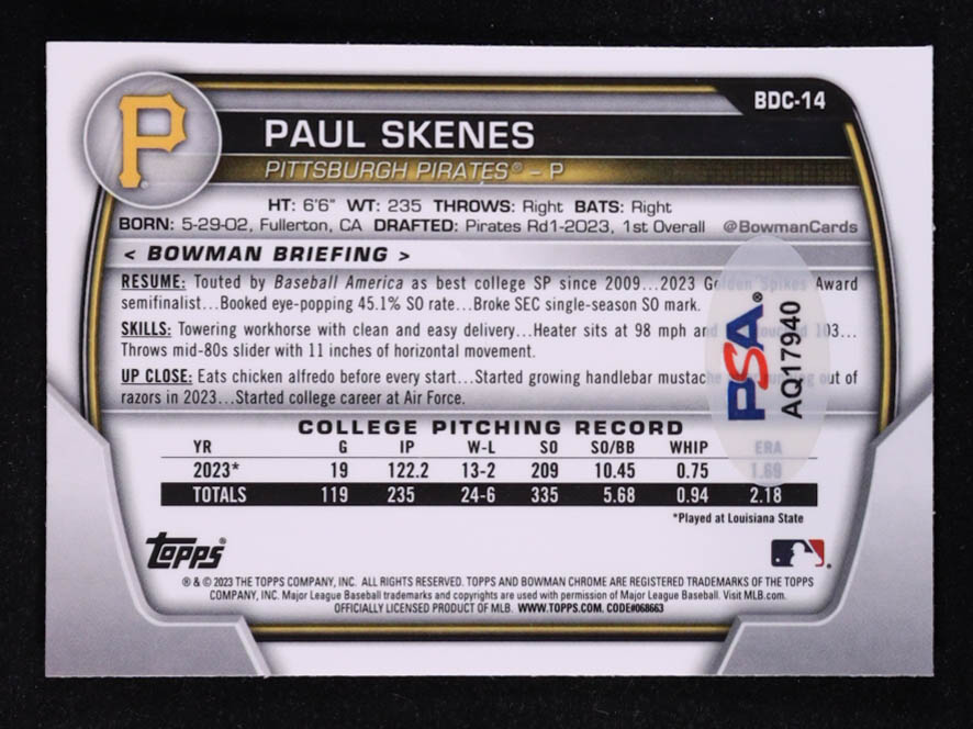Paul Skenes Signed 2023 Bowman Chrome Draft #BDC14 RC (PSA)