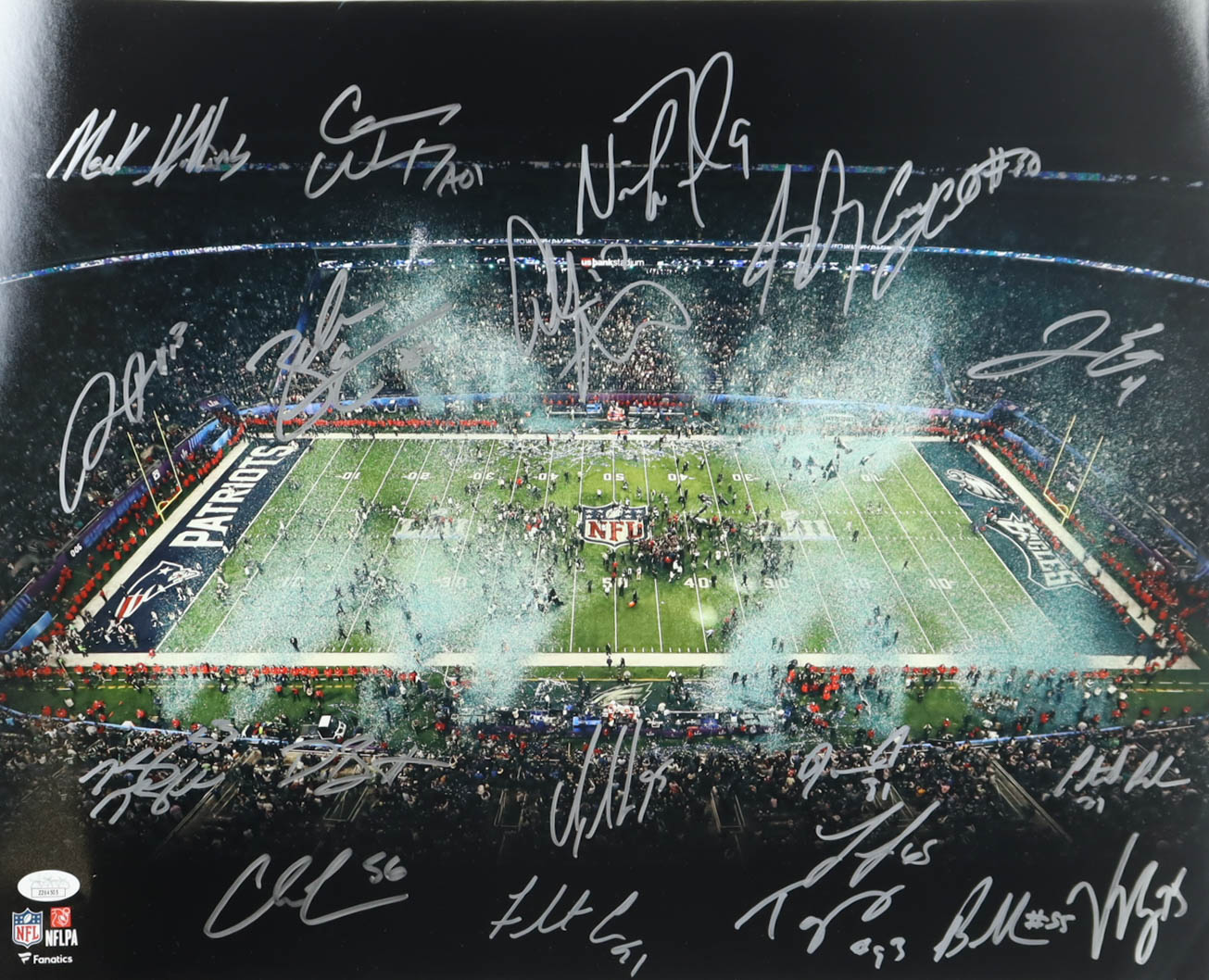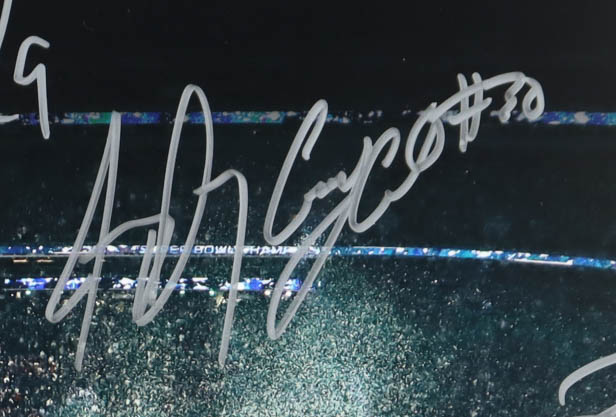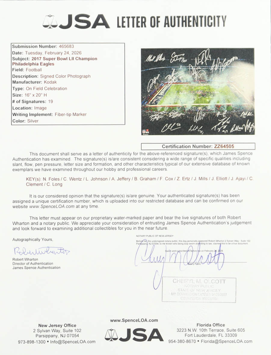 Photo measures 16" x 20" in size and has been hand-signed by (19) members of the 2017 Super Bowl Champion Philadelphia Eagles! Signers on the photo include: Nick Foles, Carson Wentz, LeGarrette Johnson, Alshon Jeffery, Brandon Graham, Fletcher Cox, Zach Ertz, Jason Mills, Jay Ajayi, Corey Clement, Lane Johnson, Carson Long, Jaylen Elliott and (6) others unknown.