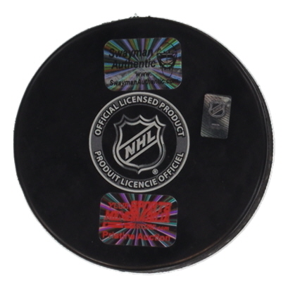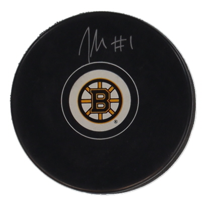 Boston Bruins logo hockey puck. Hand-signed by Jeremy Swayman.