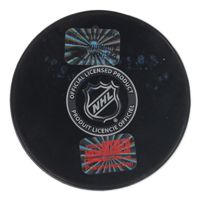 2020 All-Star Game logo hockey puck. Hand-signed by David Pastrnak. Please note that the signature is faded and smeared.