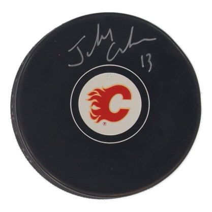 Calgary Flames logo hockey puck has been hand-signed by Johnny Gaudreau.