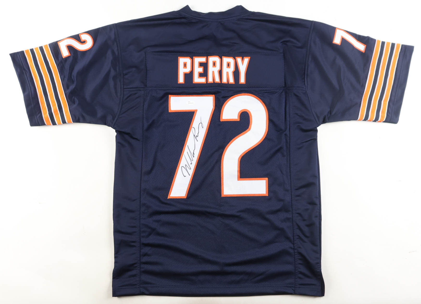 Custom jersey. Everything sewn on, size XL. Hand-signed by William Perry. Please note, glue is visible through the reverse number.
