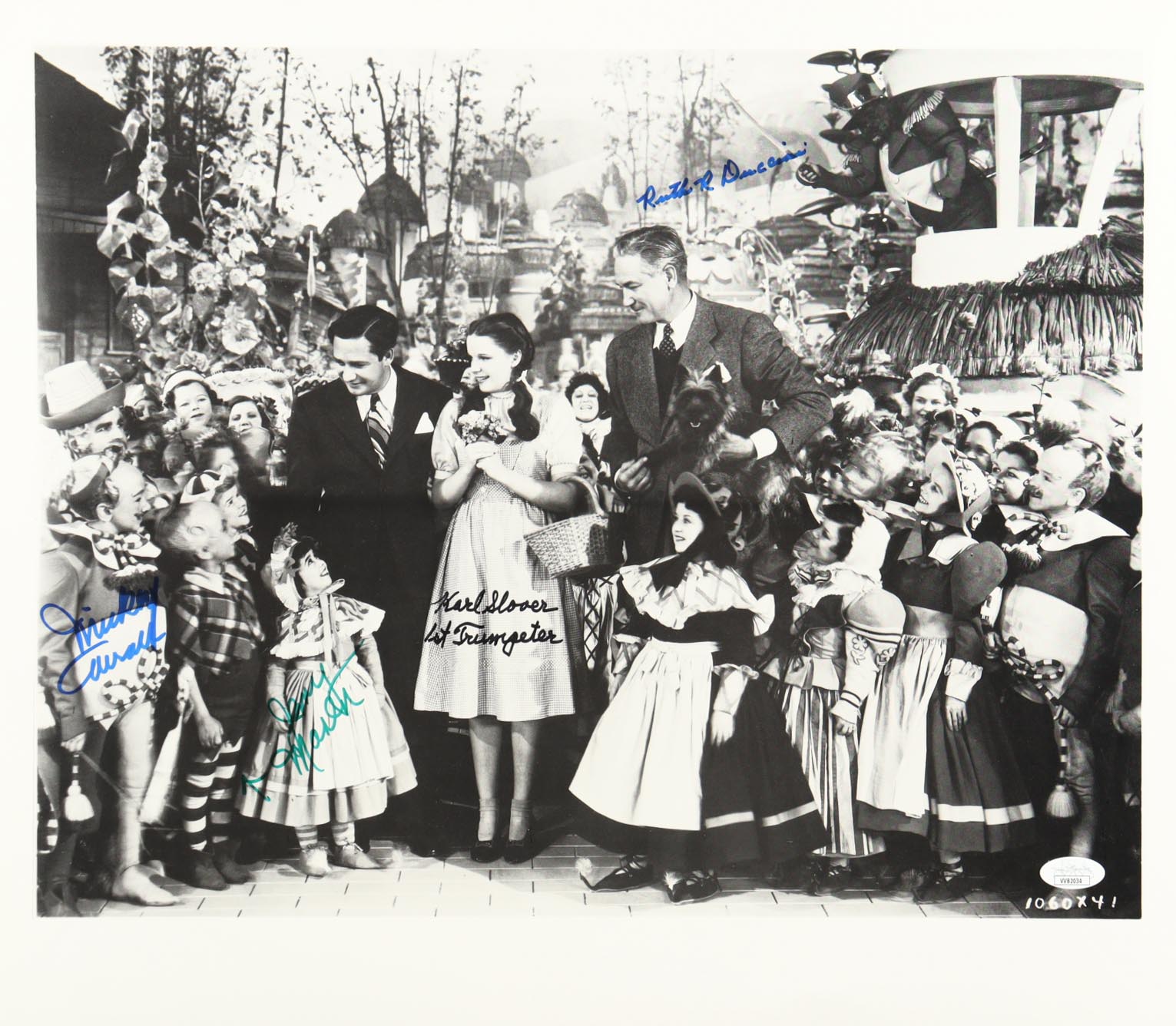 "The Wizard of Oz" 16x18.5 Photo Cast-Signed & Inscribed By (4) with Mickey Carroll, Jerry Maren, Karl Slover & Ruth Duccini (JSA)