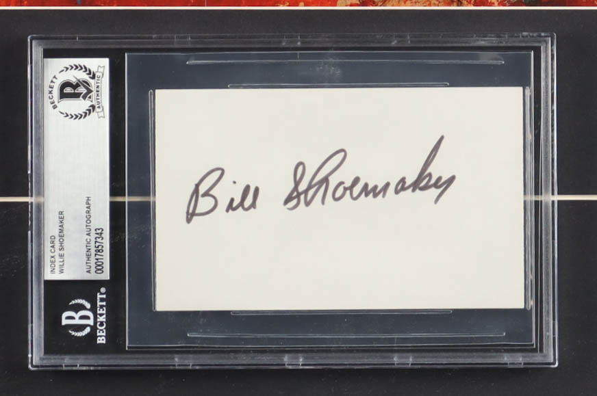 Custom frame display measures approximately 20" x 24" in size and features an index card that has been hand-signed by Bill Shoemaker (D. 2003, HOF). Display also include a LeRoy Neiman (D. 2012) art print. Please refer to photos regarding the condition of the items.
