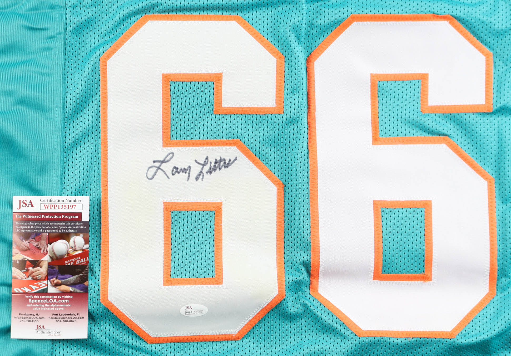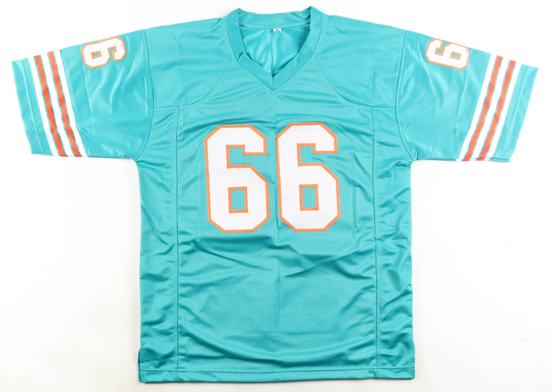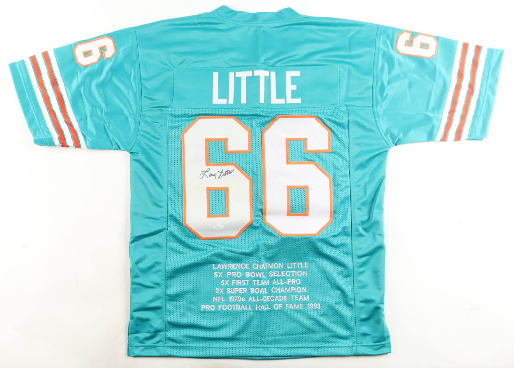 Custom jersey. Everything is sewn on, size XL. Hand-signed by Larry Little (HOF). Little's career highlights have been custom stitched onto the back of the jersey below the reverse numbers.