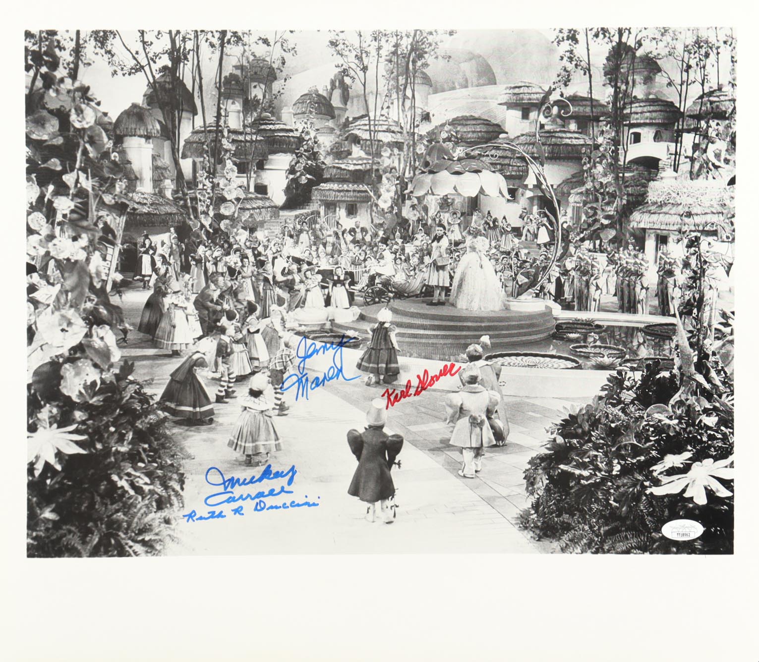 Photo measures approximately 16" x 18.5" in size and has been hand-signed by Mickey Carroll (D. 2009), Jerry Maren (D. 2018), Karl Slover (D. 2011), and Ruth Duccini (D. 2014). Please note, there are creases throughout the photo.