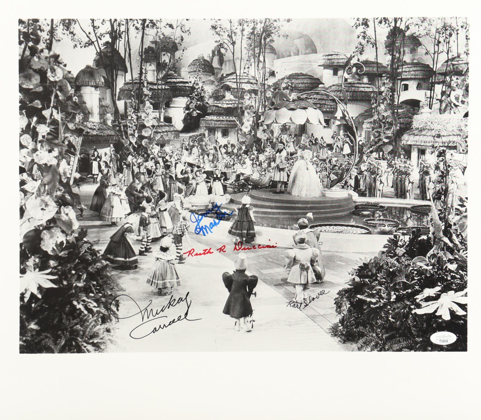 Photo measures approximately 16" x 18.5" in size and has been hand-signed by Mickey Carroll (D. 2009), Jerry Maren (D. 2018), Karl Slover (D. 2011), and Ruth Duccini (D. 2014). Please note, there are creases throughout the photo.