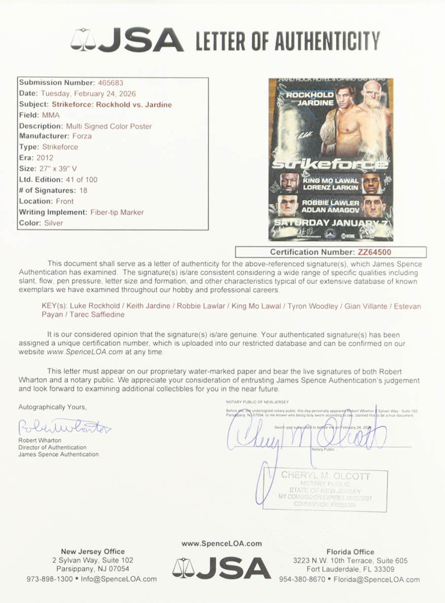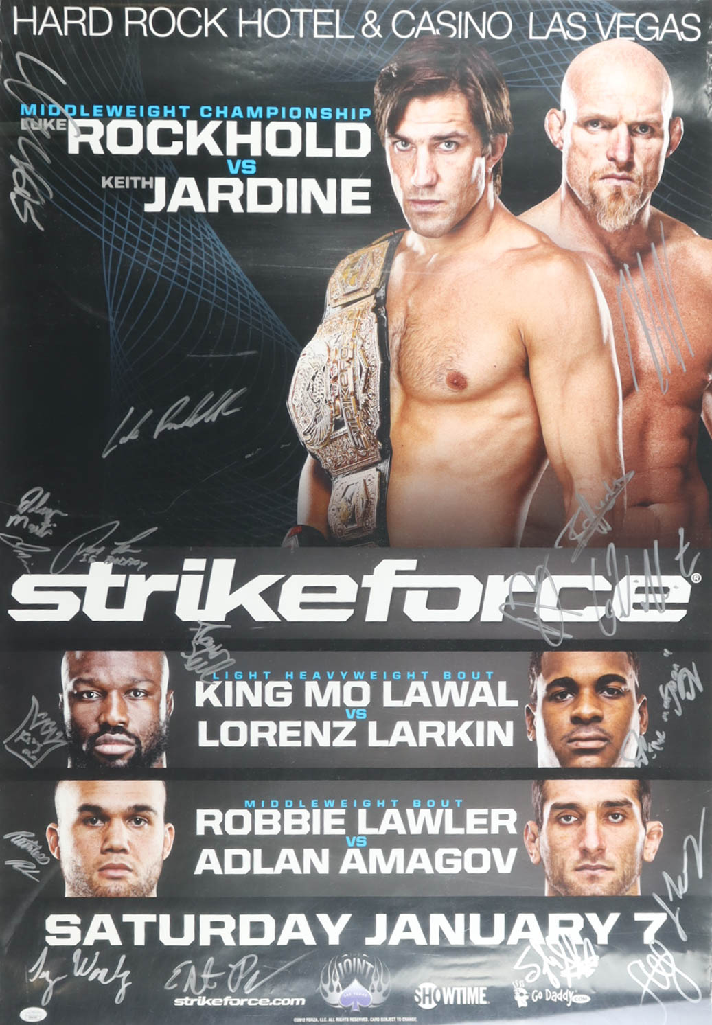 Strikeforce: Rockhold vs Jardine 27x39 Poster Signed by (18) with Luke Rockhold, Keith Jardine, King Mo Lawal, Tyron Woodley (JSA)