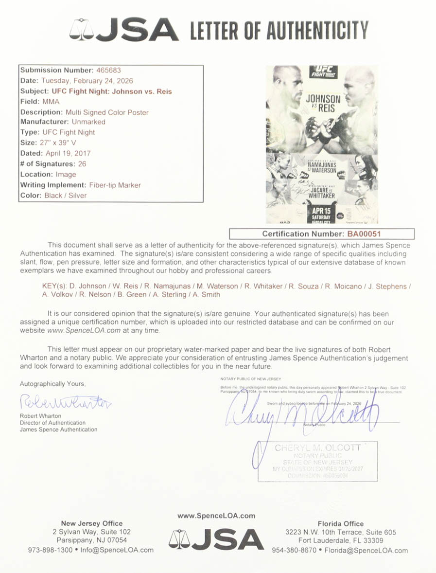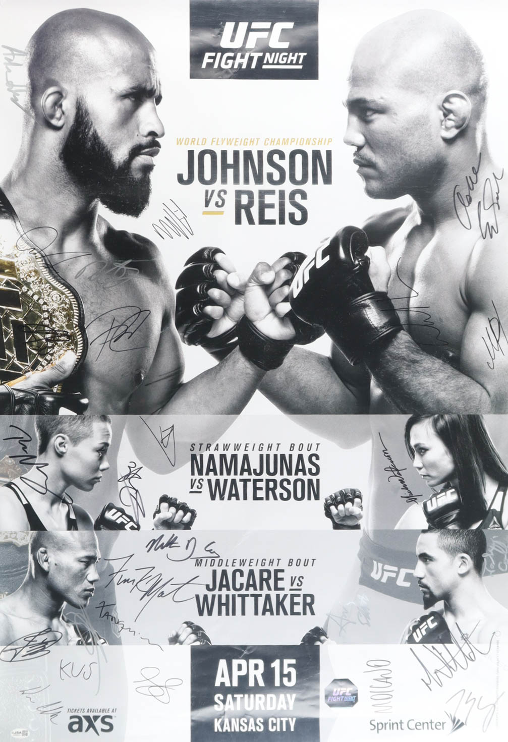 UFC Fight Night: Johnson vs Reis 27x39 Poster Signed by (26) with Demetrious Johnson, Wilson Reis, Robert Whittaker, Rose Namajunas (JSA)