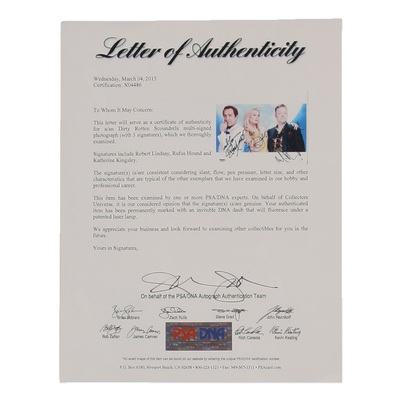 Photograph measures 8" x 10" in size. Hand-signed by Robert Lindsay, Rufus Hound, and Katherine Kingsley.