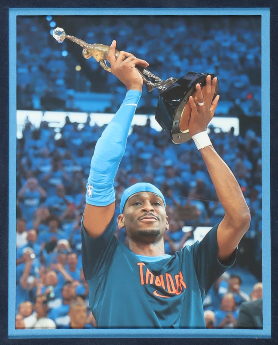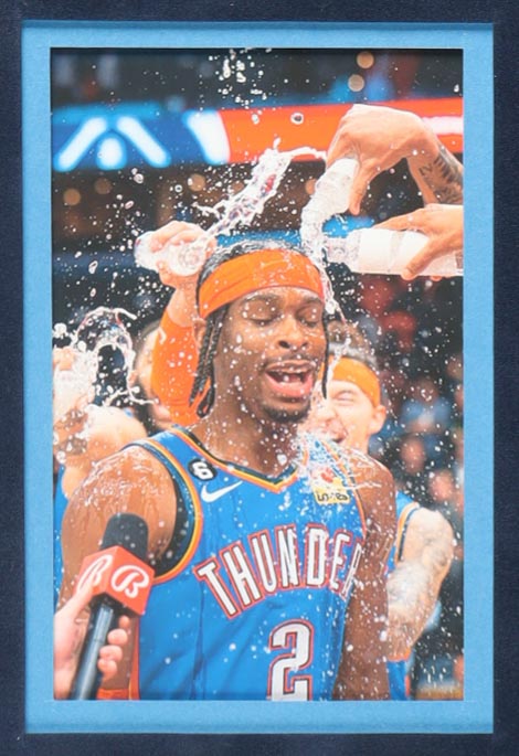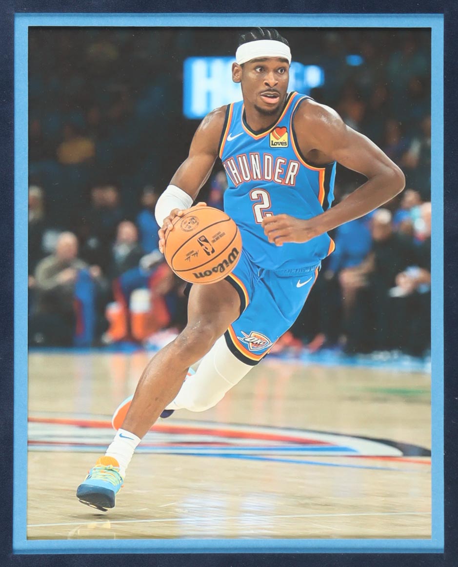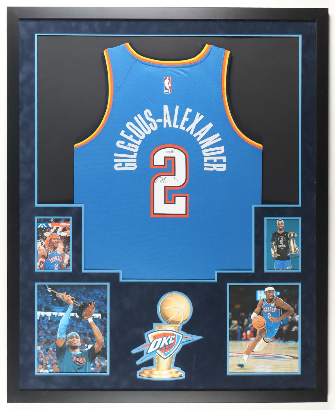 Custom frame measures approximately 34" x 42" in size and features a jersey that has been hand-signed by Shai Gilgeous-Alexander. Display also includes (2) 8" x 10" photos and (2) 4" x 5" photos.
