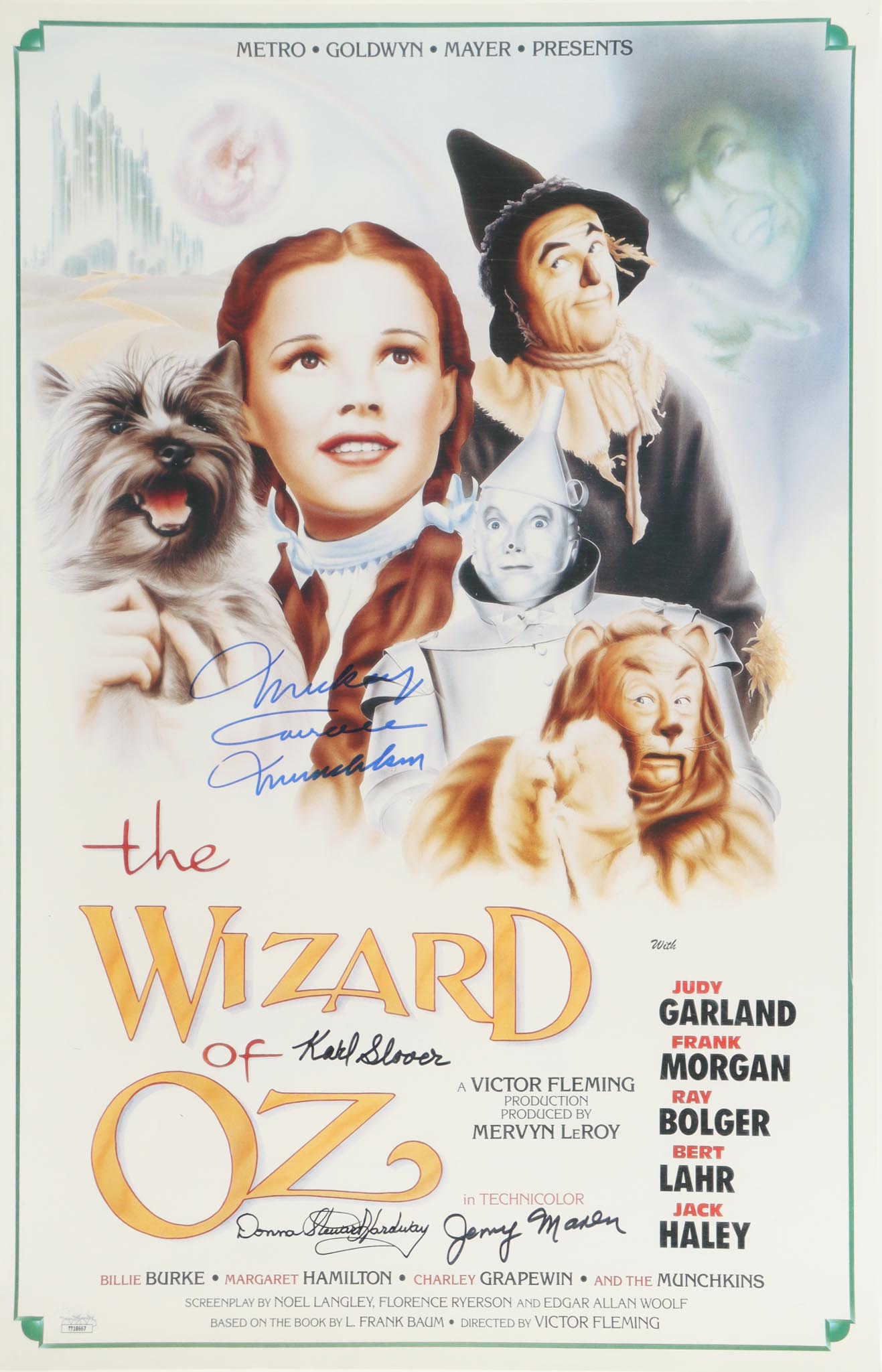 Poster measures approximately 16" x 24" in size and has been hand-signed and inscribed by Mickey Carroll (D. 2009), Jerry Maren (D. 2018), Karl Slover (D. 2011), and Donna Stewart Hardway (D. 2008). Please note, there are creases throughout the poster.