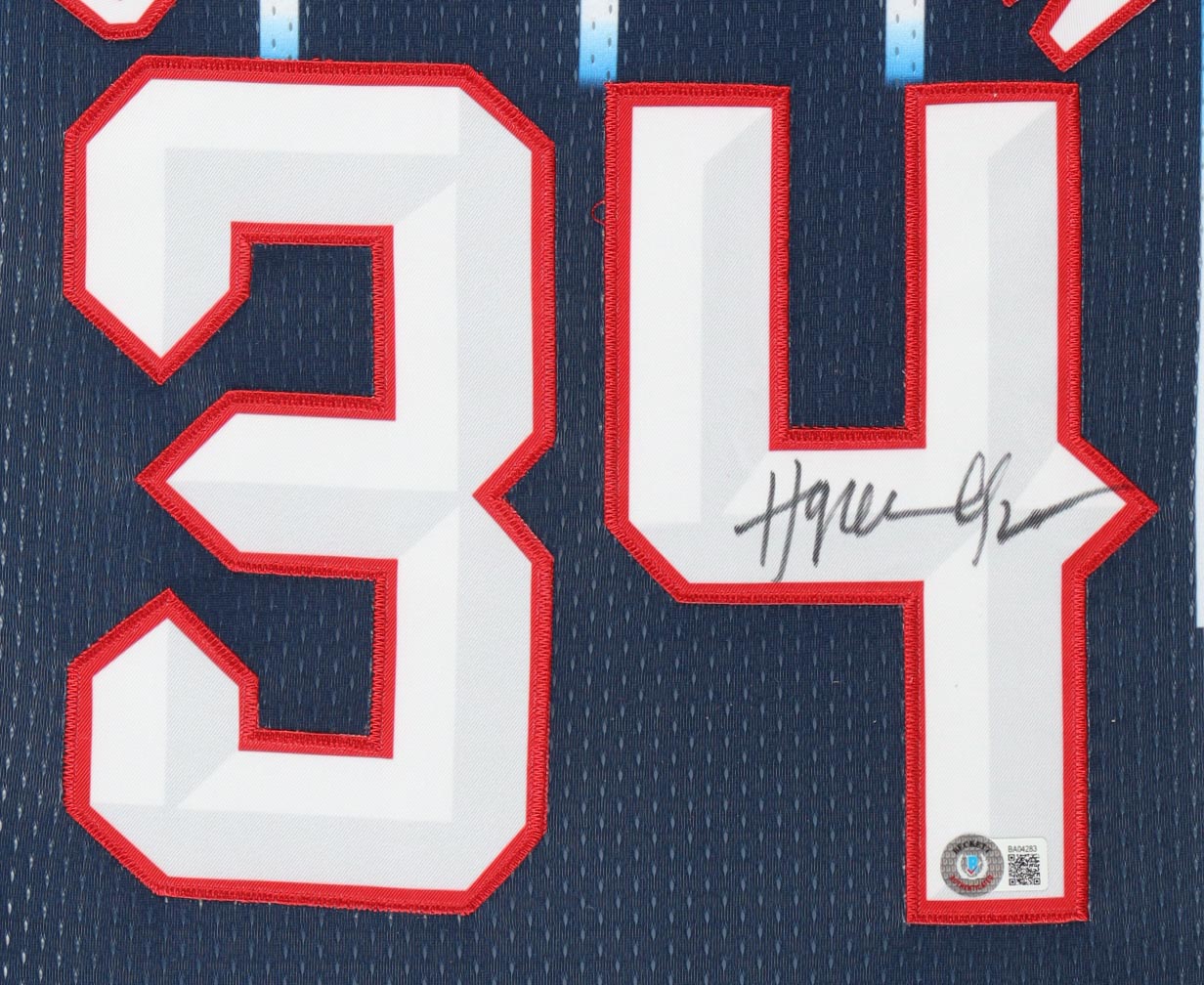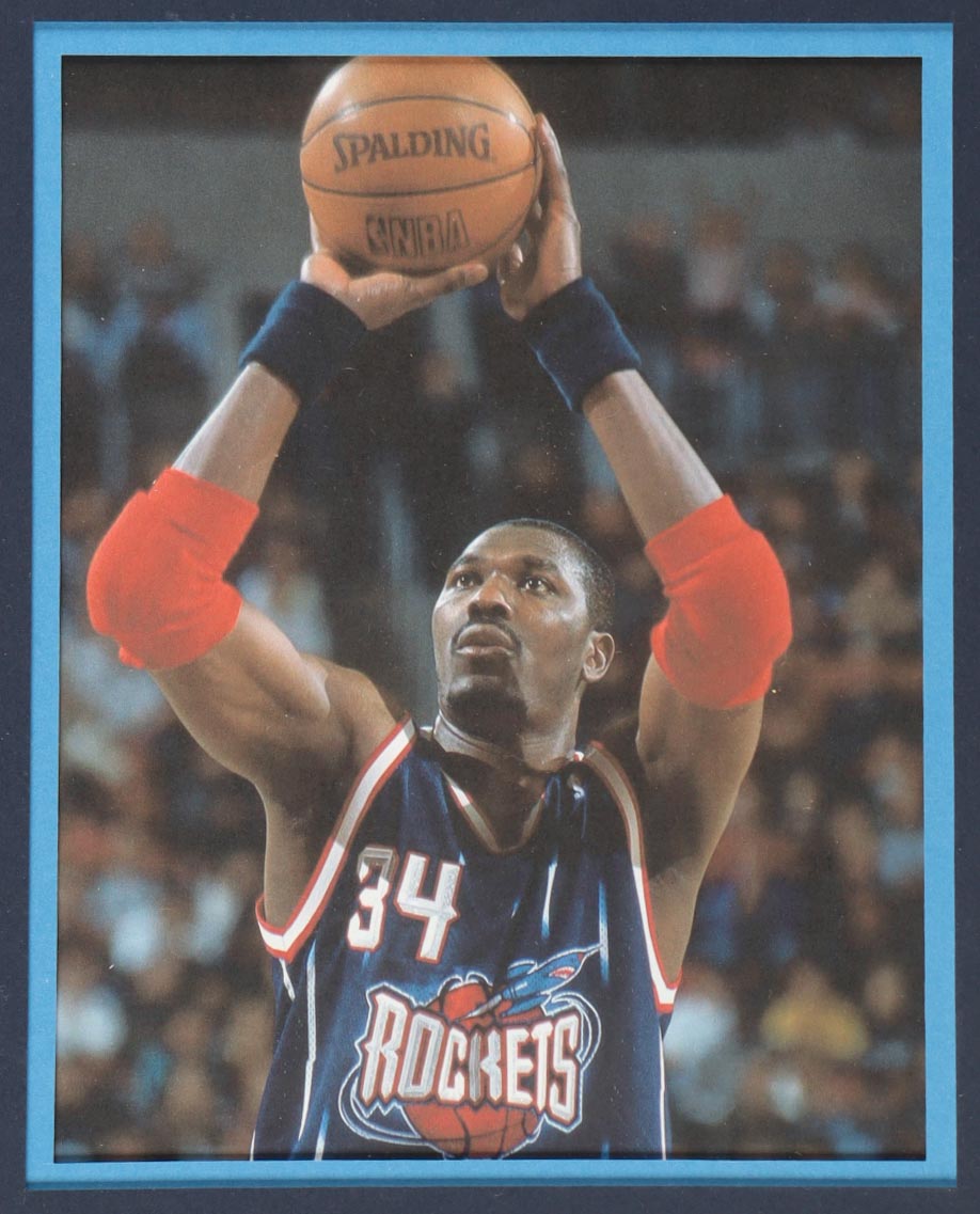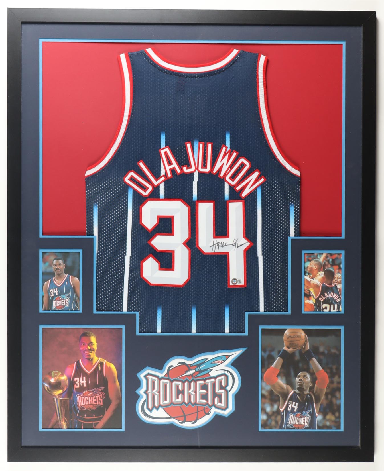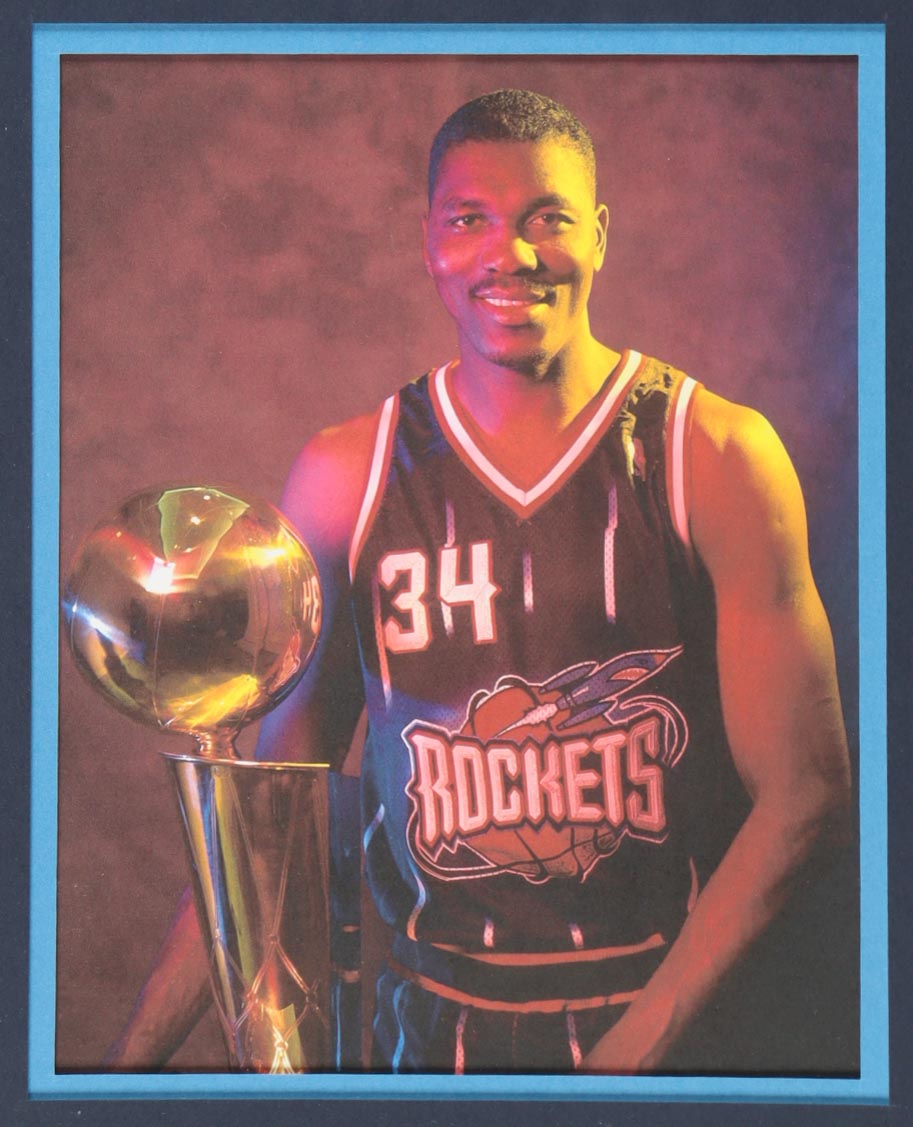 Custom frame measures 34" x 42" in size and features a custom jersey that has been hand-signed by Hakeem Olajuwon (Houston Rockets, HOF). Please refer to photos regarding the condition of the item.