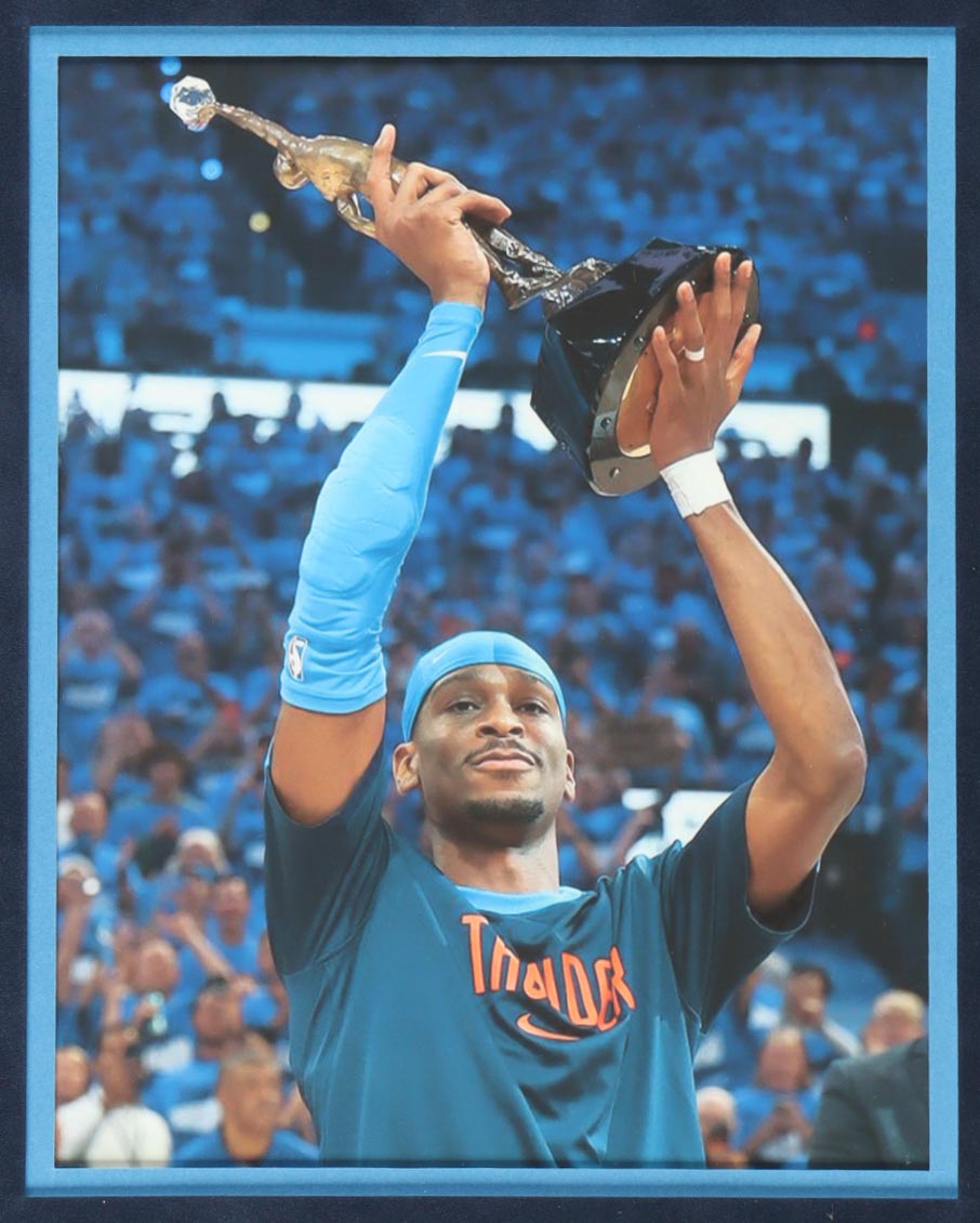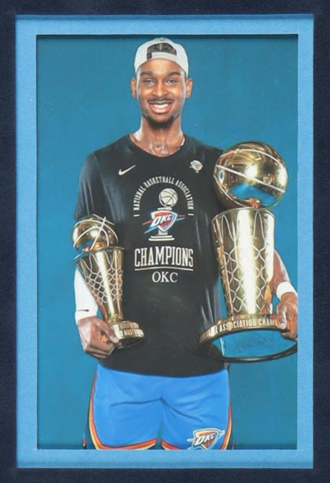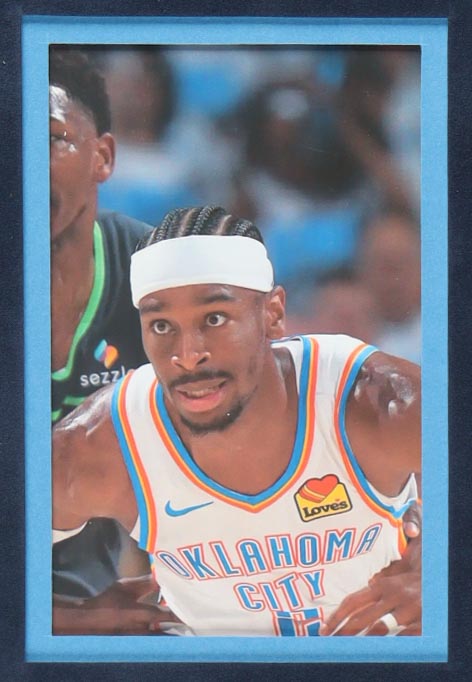 Custom frame measures approximately 34" x 42" in size and features a jersey that has been hand-signed by Shai Gilgeous-Alexander. Display also includes (2) 8" x 10" photos and (2) 4" x 5" photos.