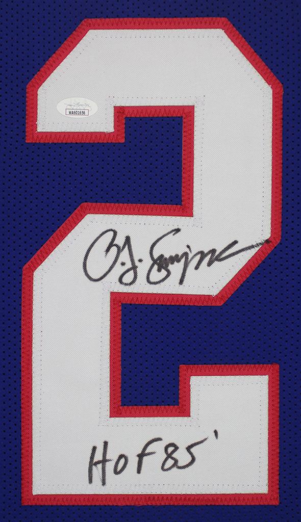 Custom frame measures 35" x 43" in size and features a jersey that has been hand-signed and inscribed by OJ Simpson (D. 2024, HOF).