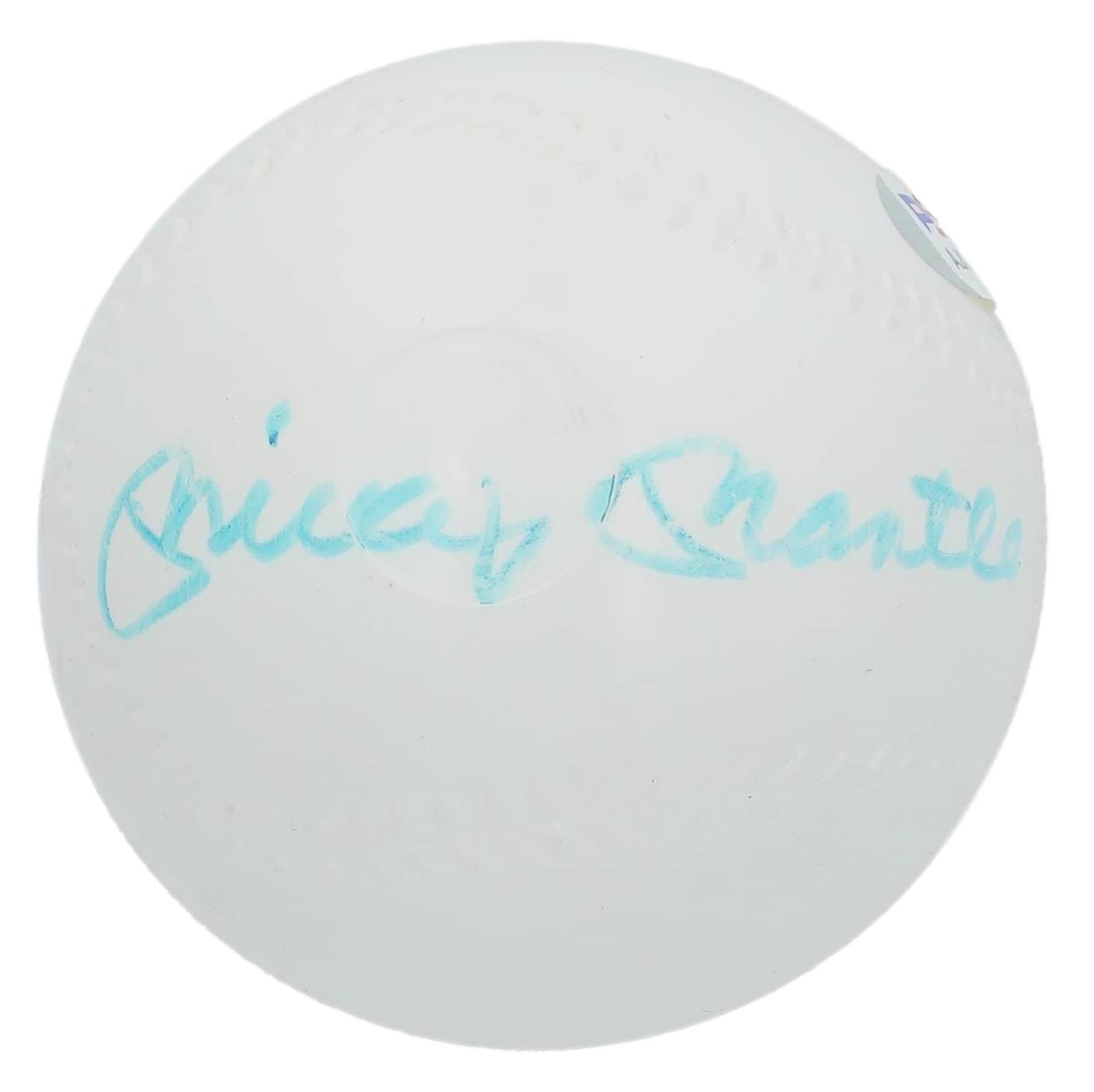 Plastic baseball has been hand-signed by Mickey Mantle (D. 1995, New York Yankees, HOF).