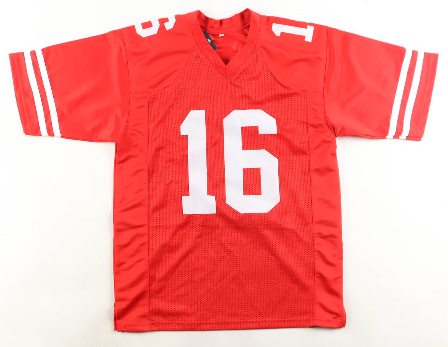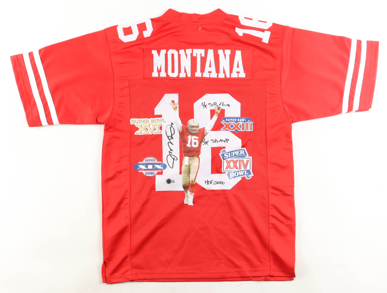 Custom jersey with everything sewn on, size L. Hand-signed and inscribed by Joe Montana (HOF). The jersey features a custom photos pressed on the back of the jersey.