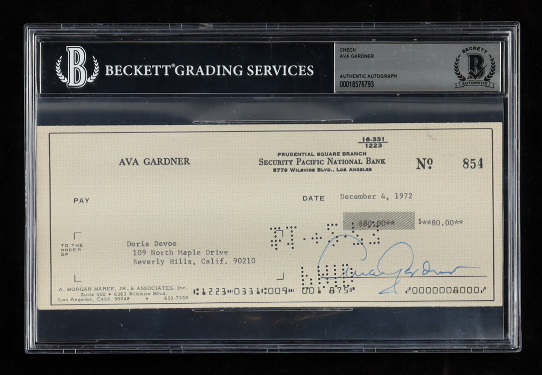 Ava Gardner Signed 1972 Personal Check (BGS)