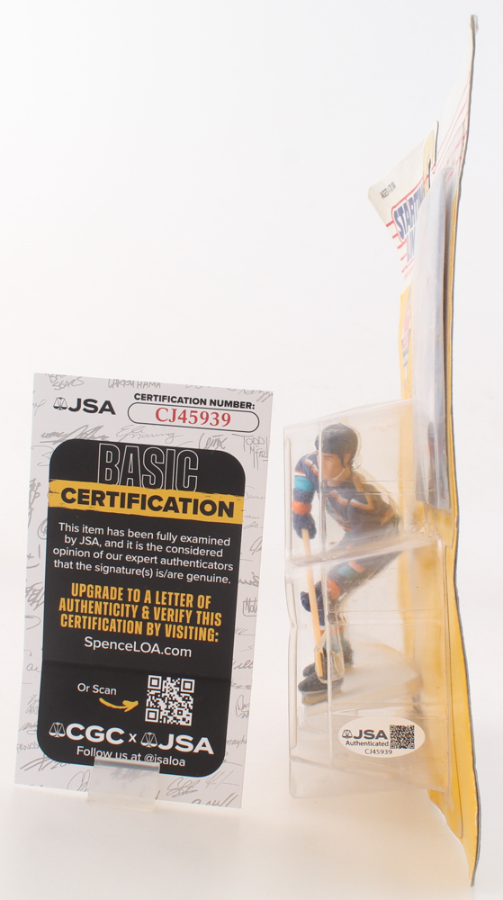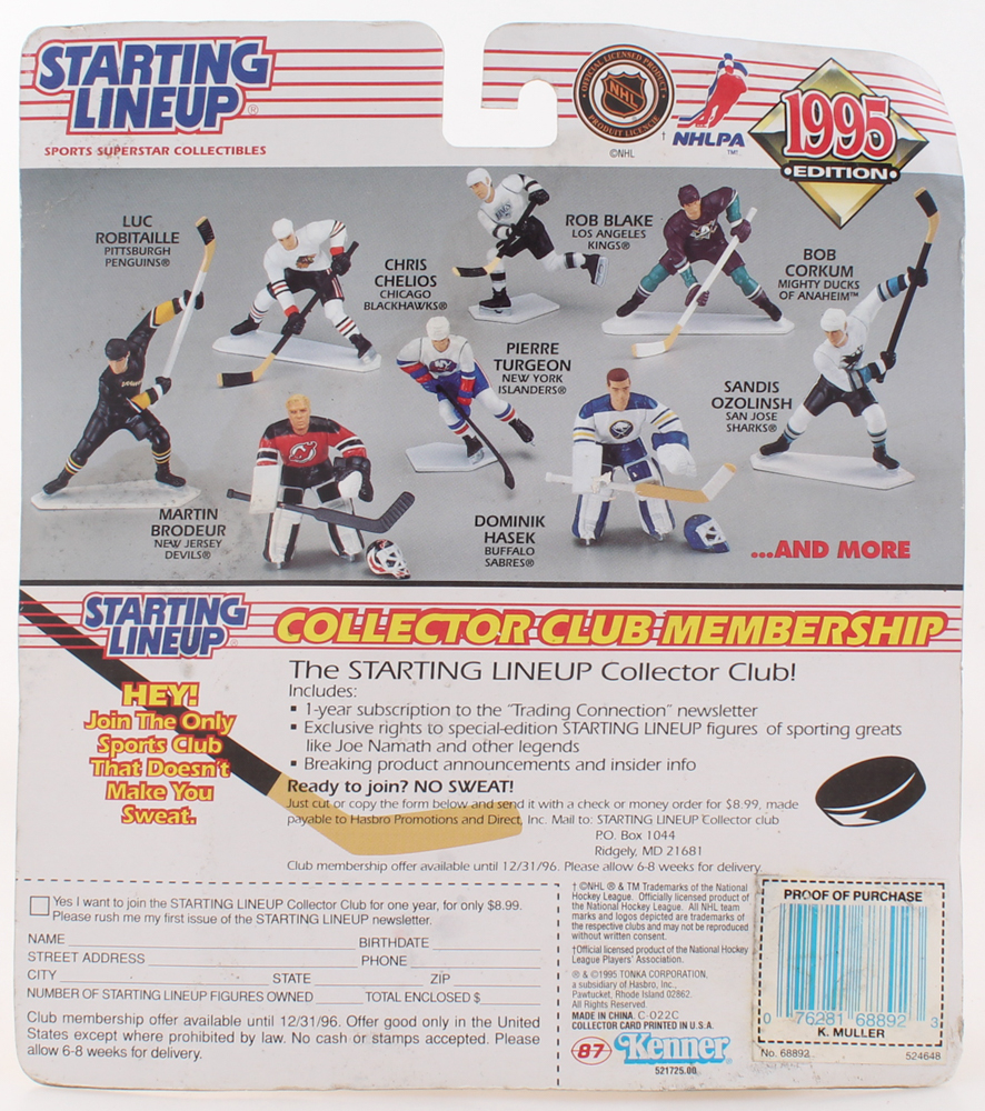 Starting Lineup "Sports Superstar Collectible" Action Figure with Trading Card. Hand-signed on the packaging by Kirk Muller (Montreal Canadiens / New York Islanders). Please note, there are creases and stains throughout the packaging.