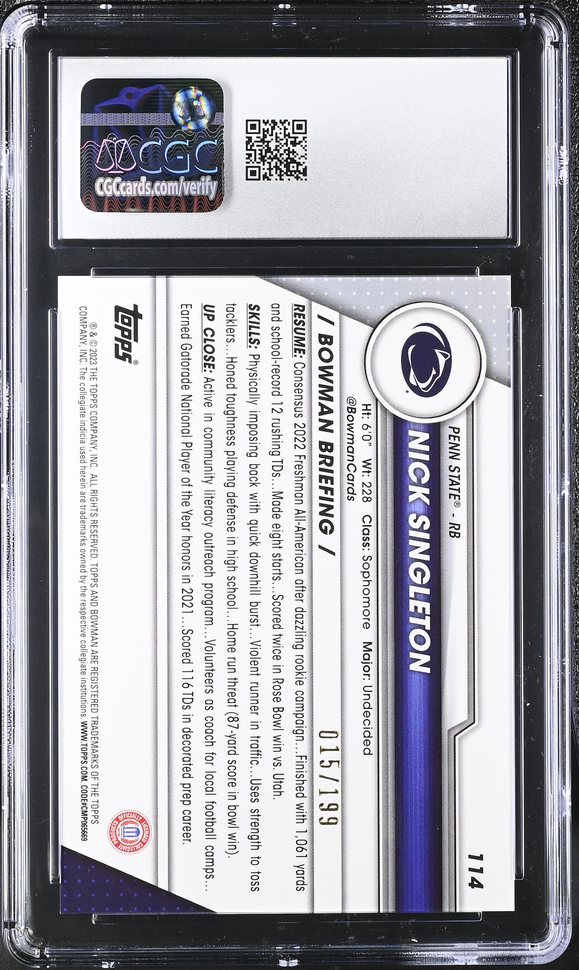 Nick Singleton 2023 Bowman Chrome University Blue Refractors #114 RC #015/199 (CGC MINT 9.5)