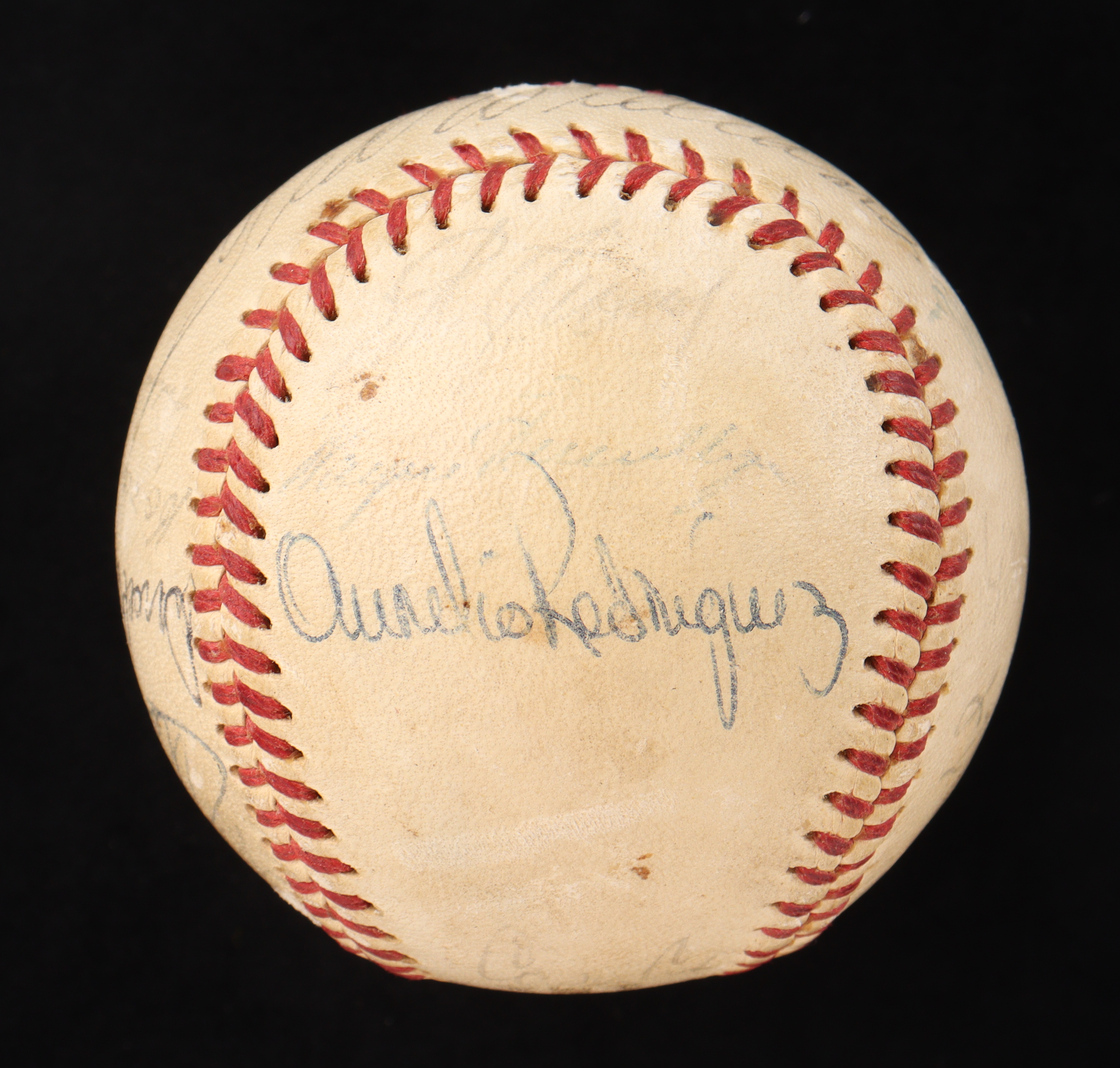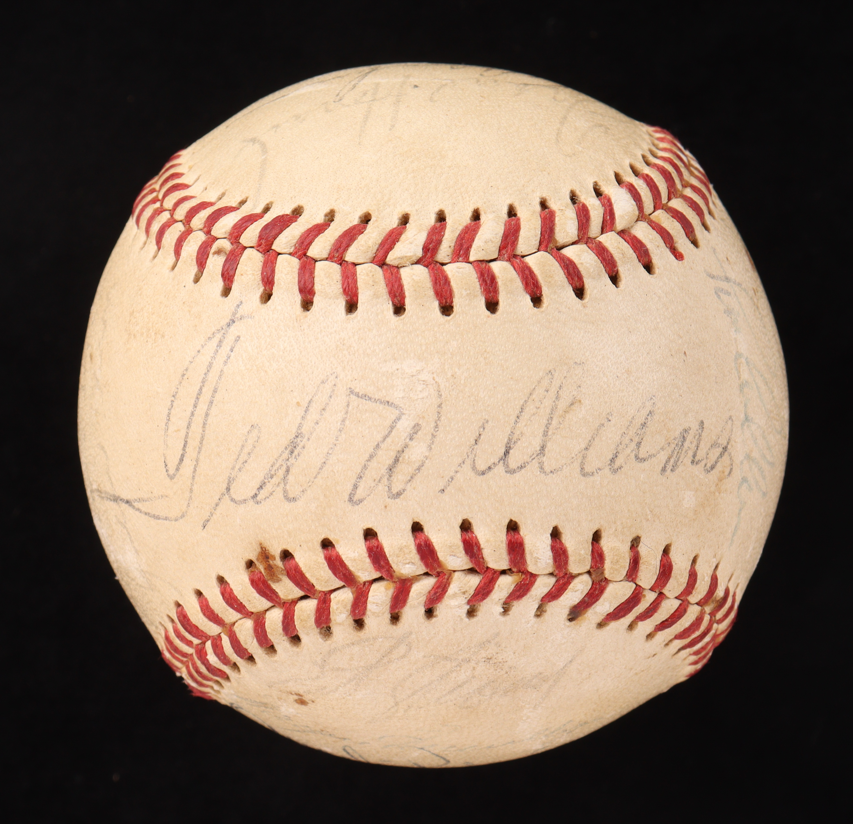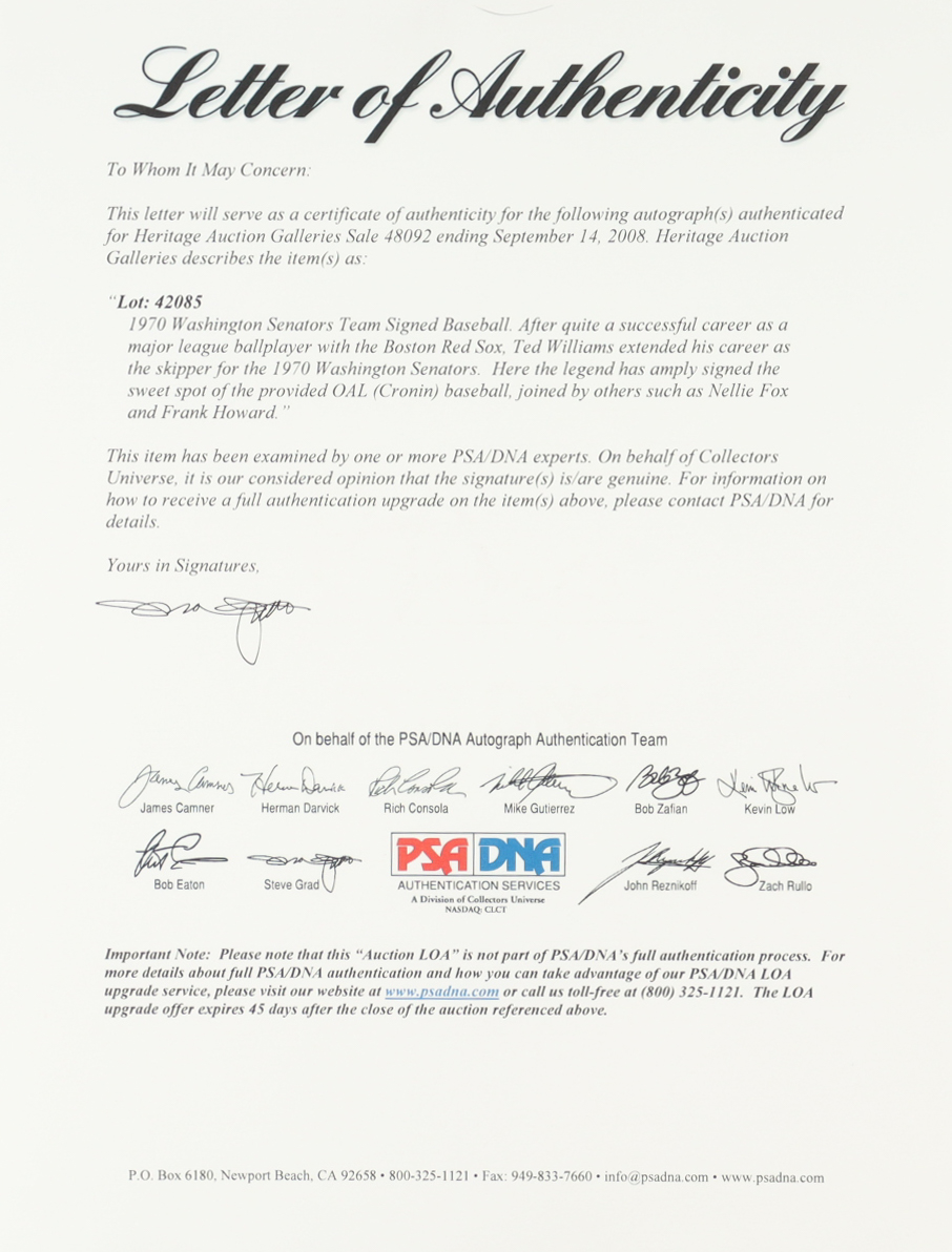 Rawlings Official American League Baseball. Hand-signed by (20) with Ted Williams, Nellie Fox, Frank Howard, Tim Cullen, Del Unser, Alex Rodriguez, Brandon Allen and (13) others. Note that the display case and Hall of Fame Logo pin are included in the listing. Please see photos for more details on condition of item.
